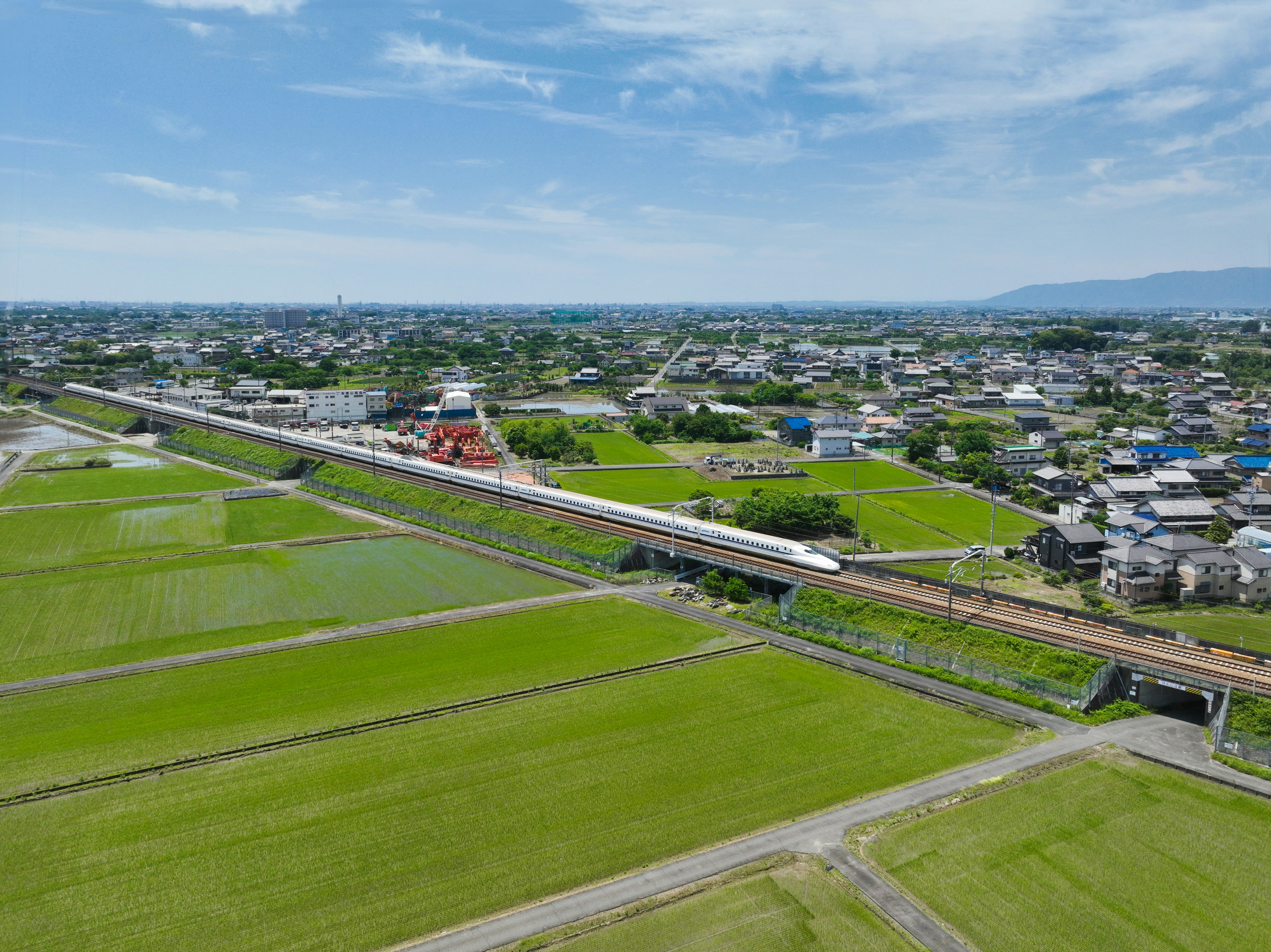 an aerial view of a train on a track