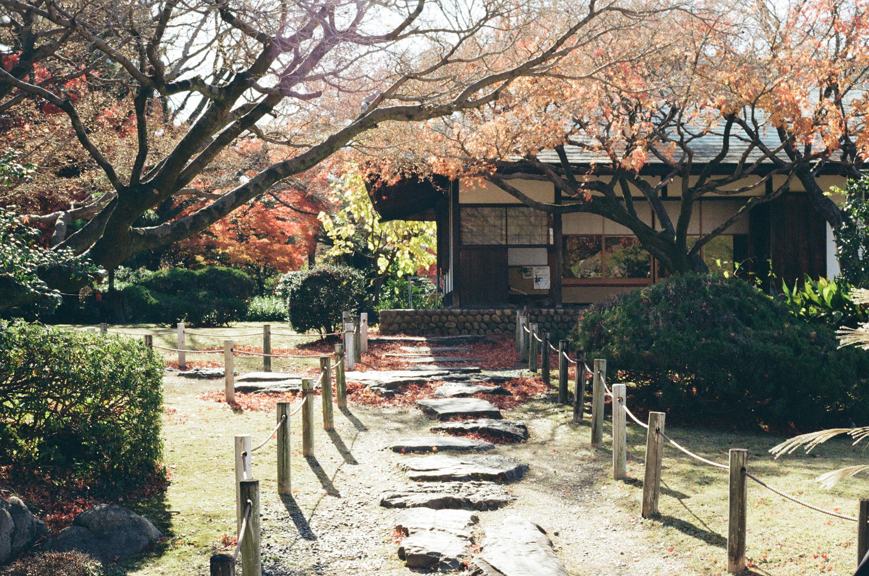 Stone path leads to a traditional japanese house.