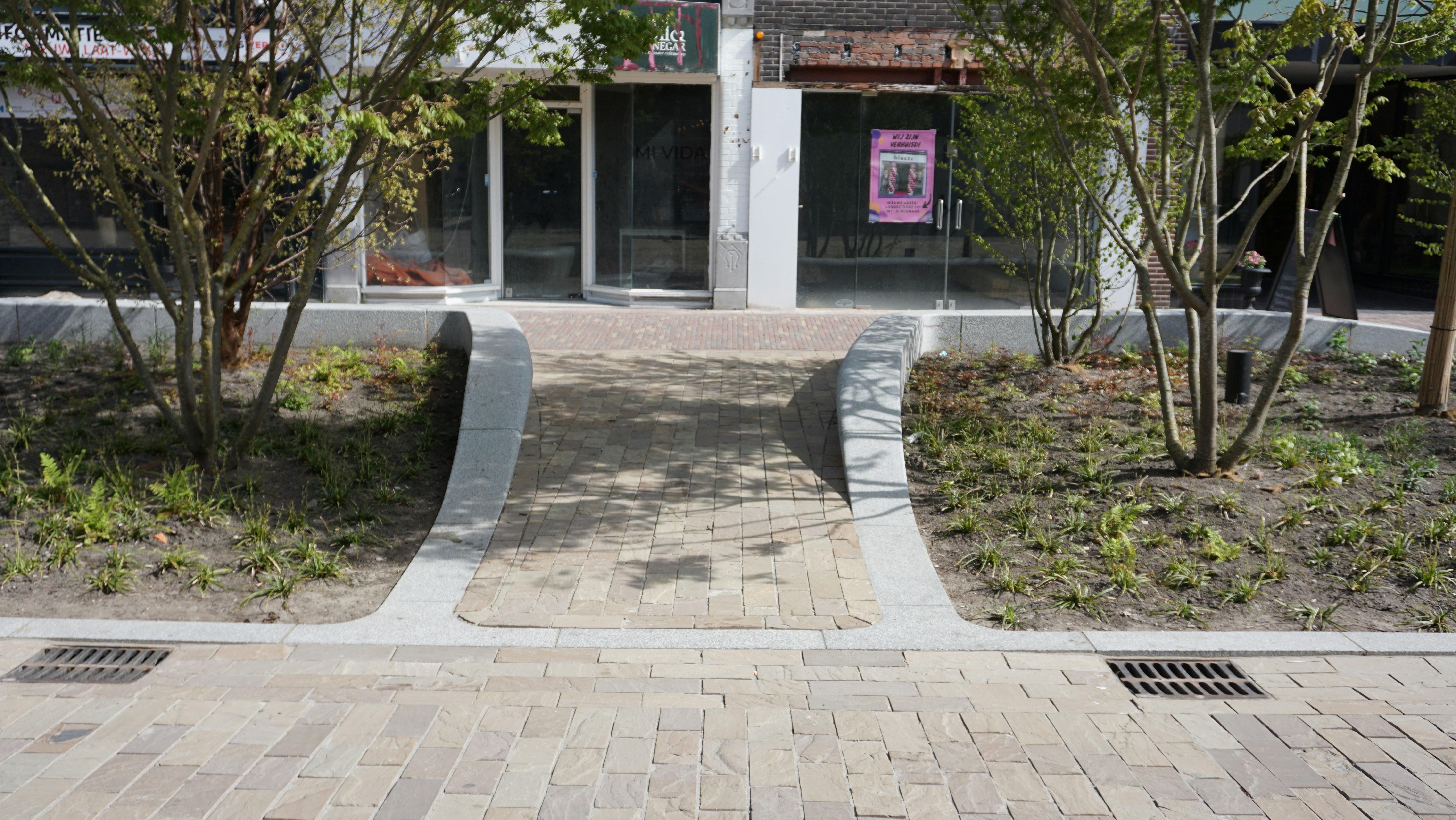 a sidewalk in front of a building with trees