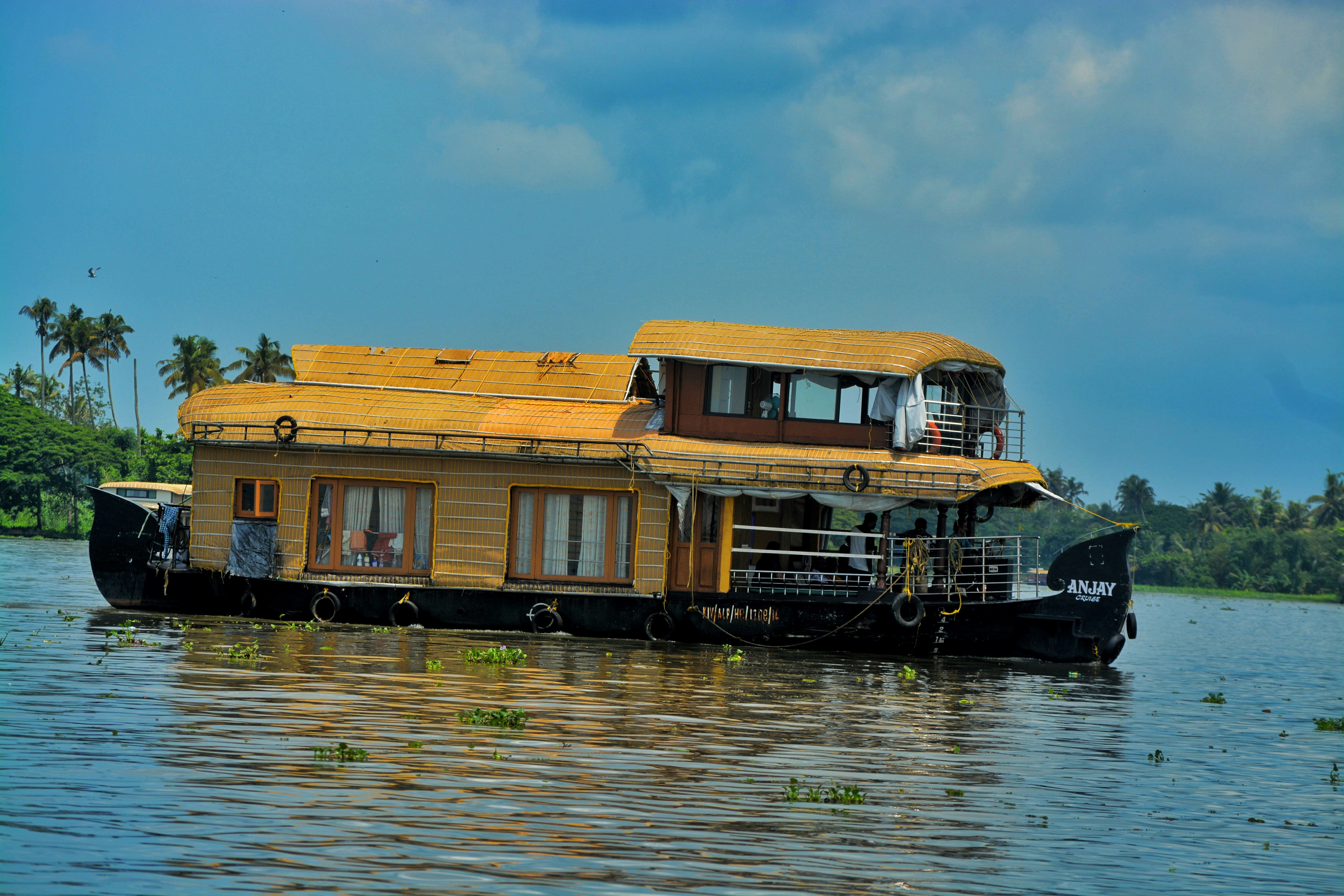a house boat floating on top of a body of water