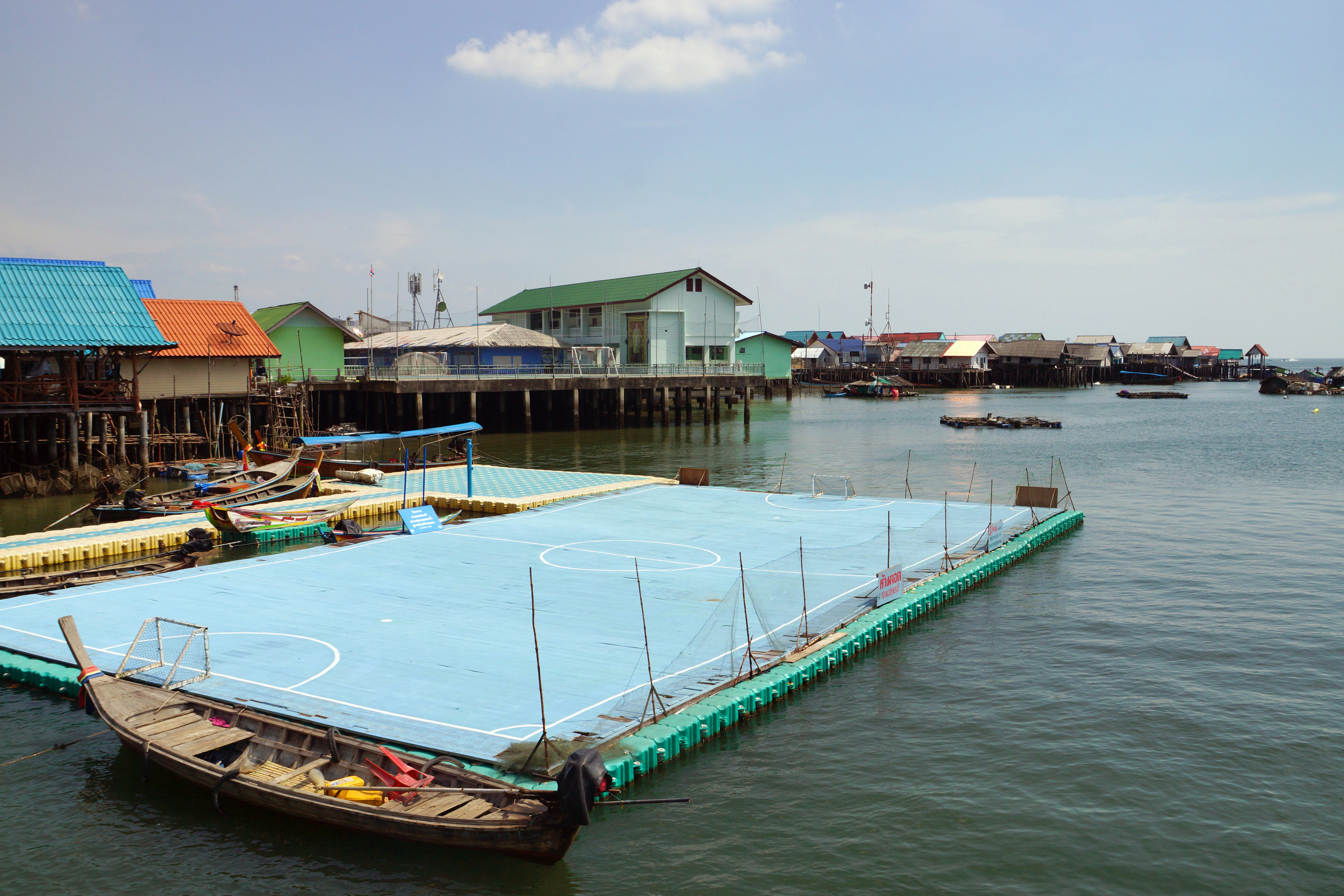 View of the Timleless Sea Gypsy Village in Phang Nga Bay in Thailand with a floating soccer field in the front.