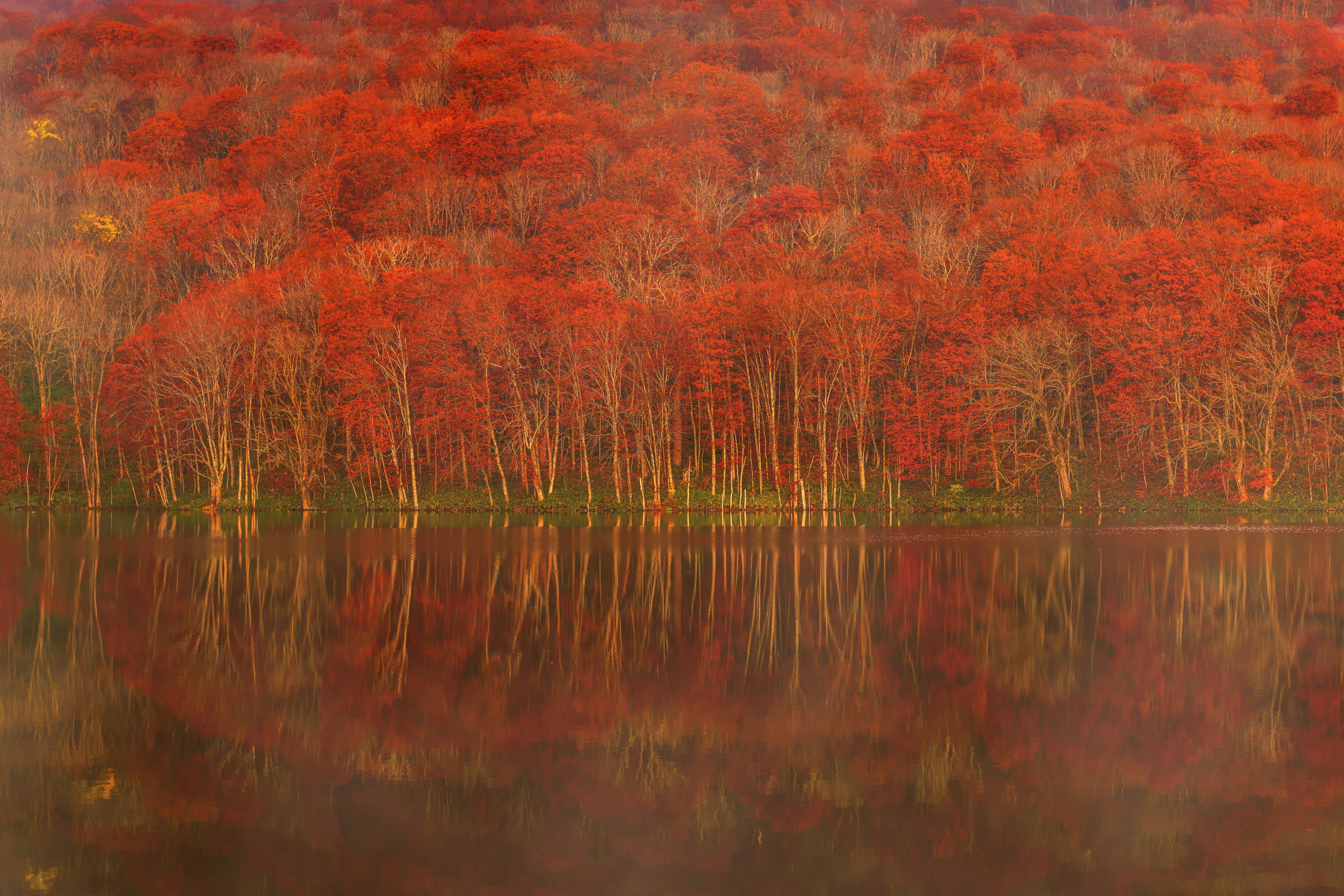 red and green trees beside body of water