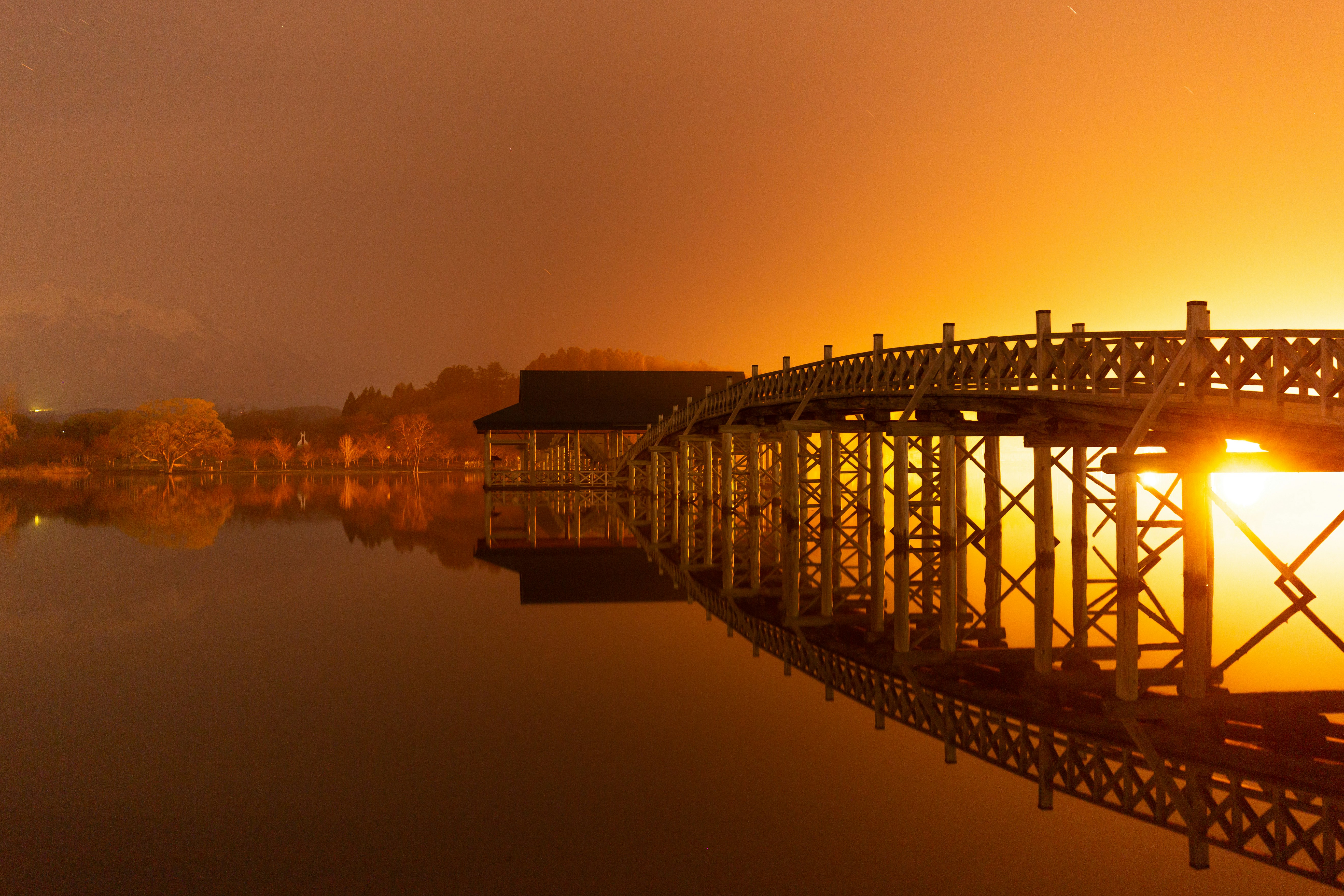 青森県鶴田町にある津軽富士見湖は人造湖で正式にはため池になります。この場所には日本一長い木造の橋「鶴の舞橋)がかかっています。