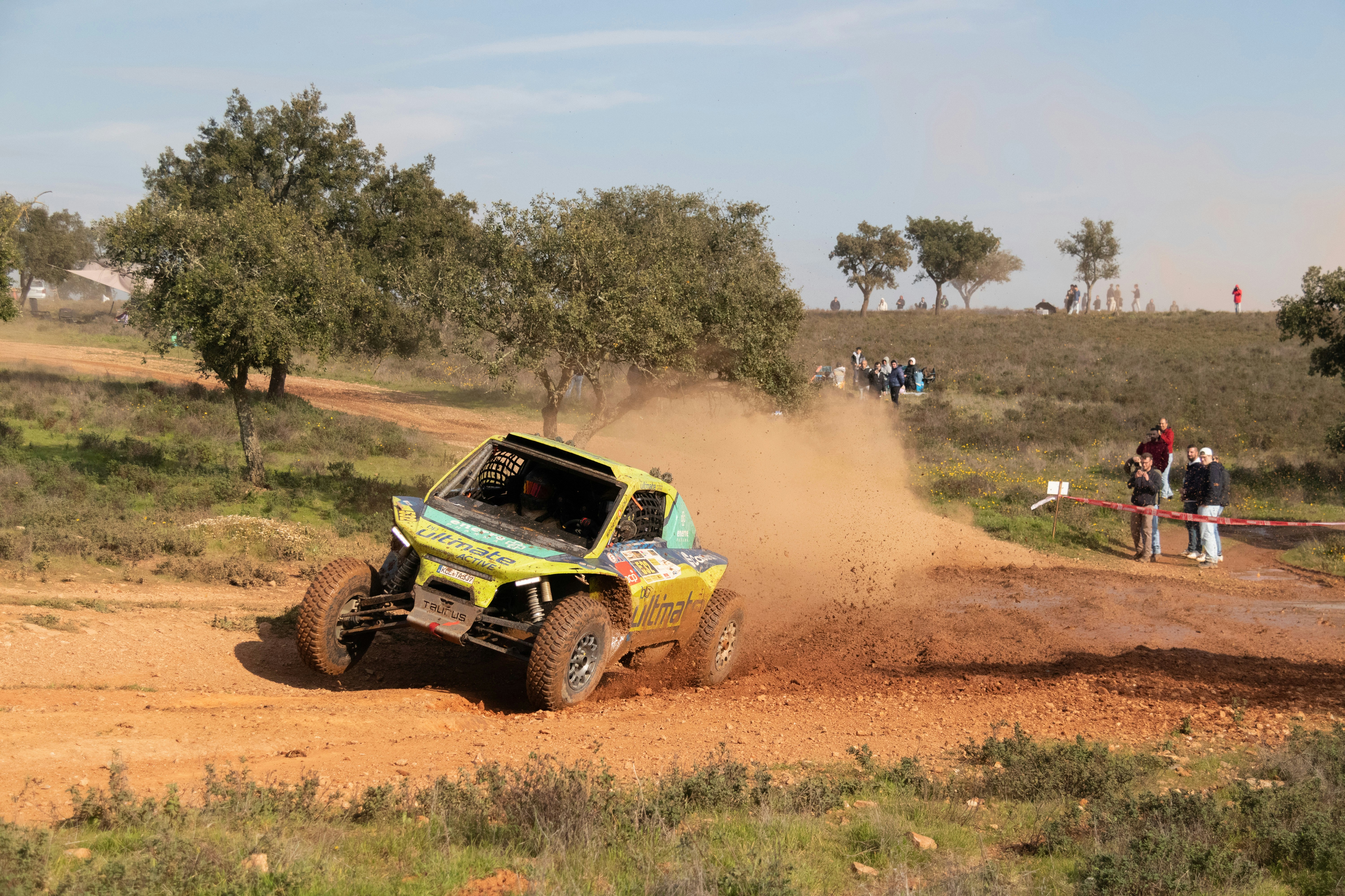 An off-road vehicle speeds through a dusty trail.