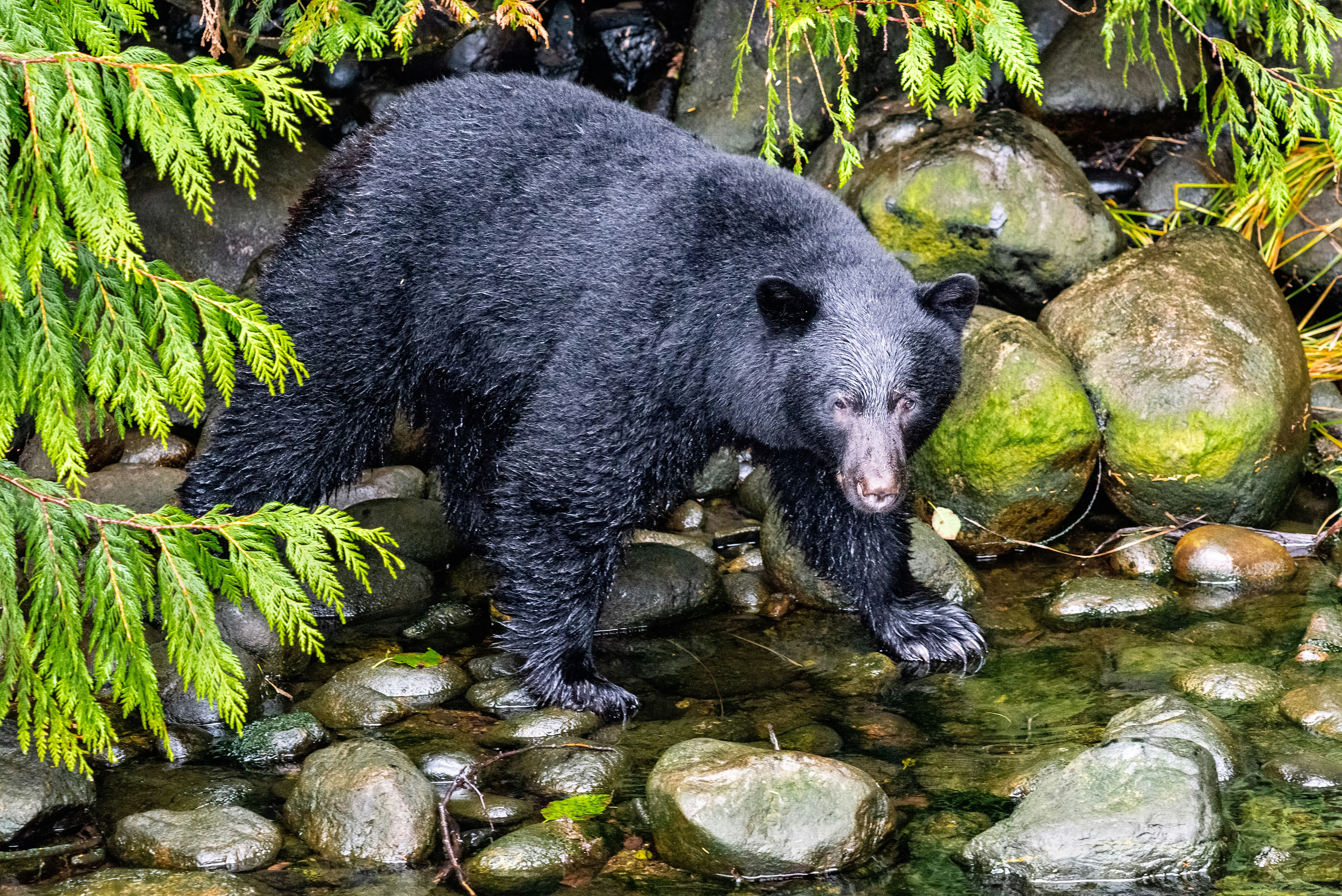 Black bear cubs eating a salmon on a river on Vancouver Island.