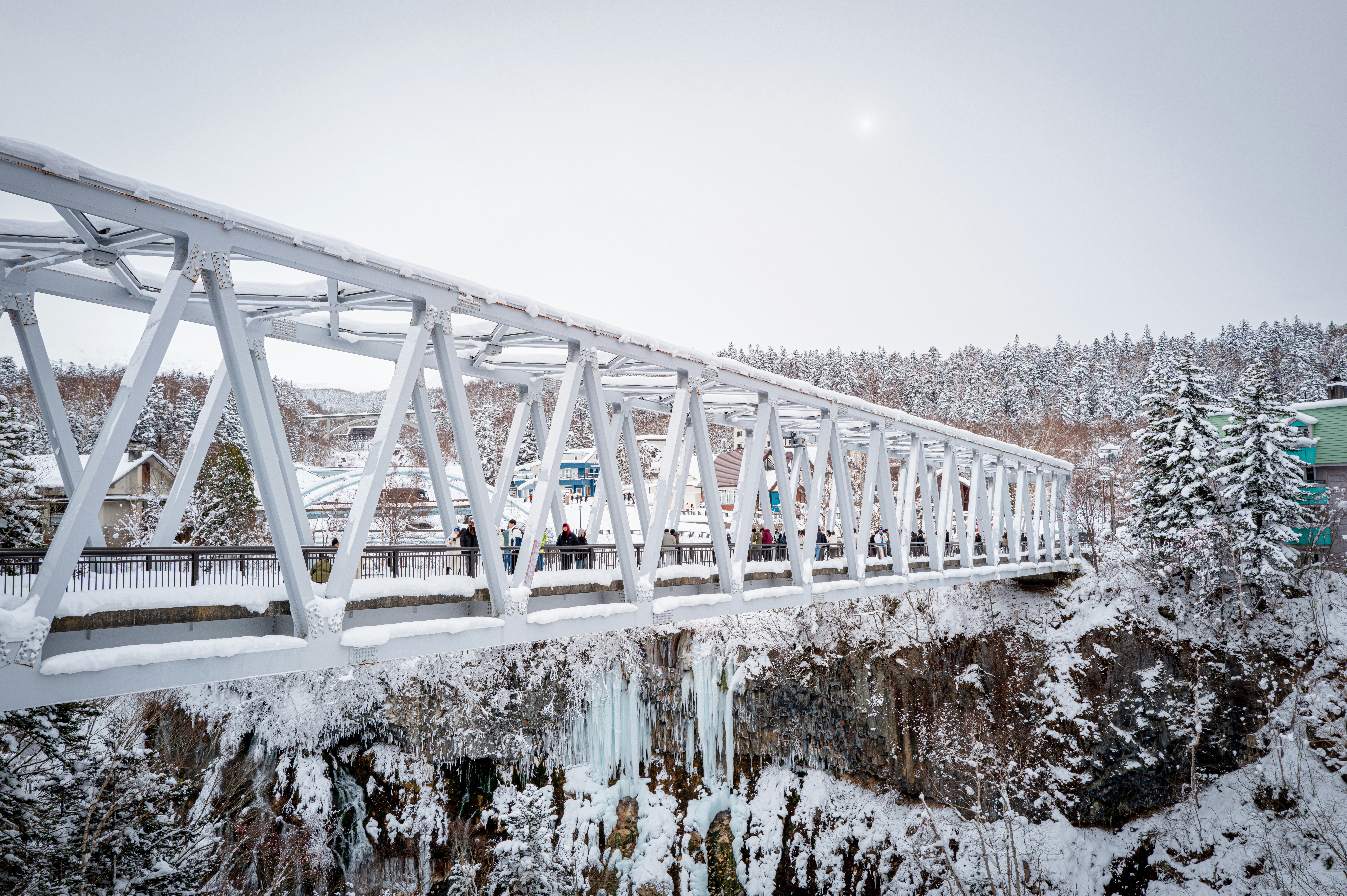 A bridge over a frozen river in the winter