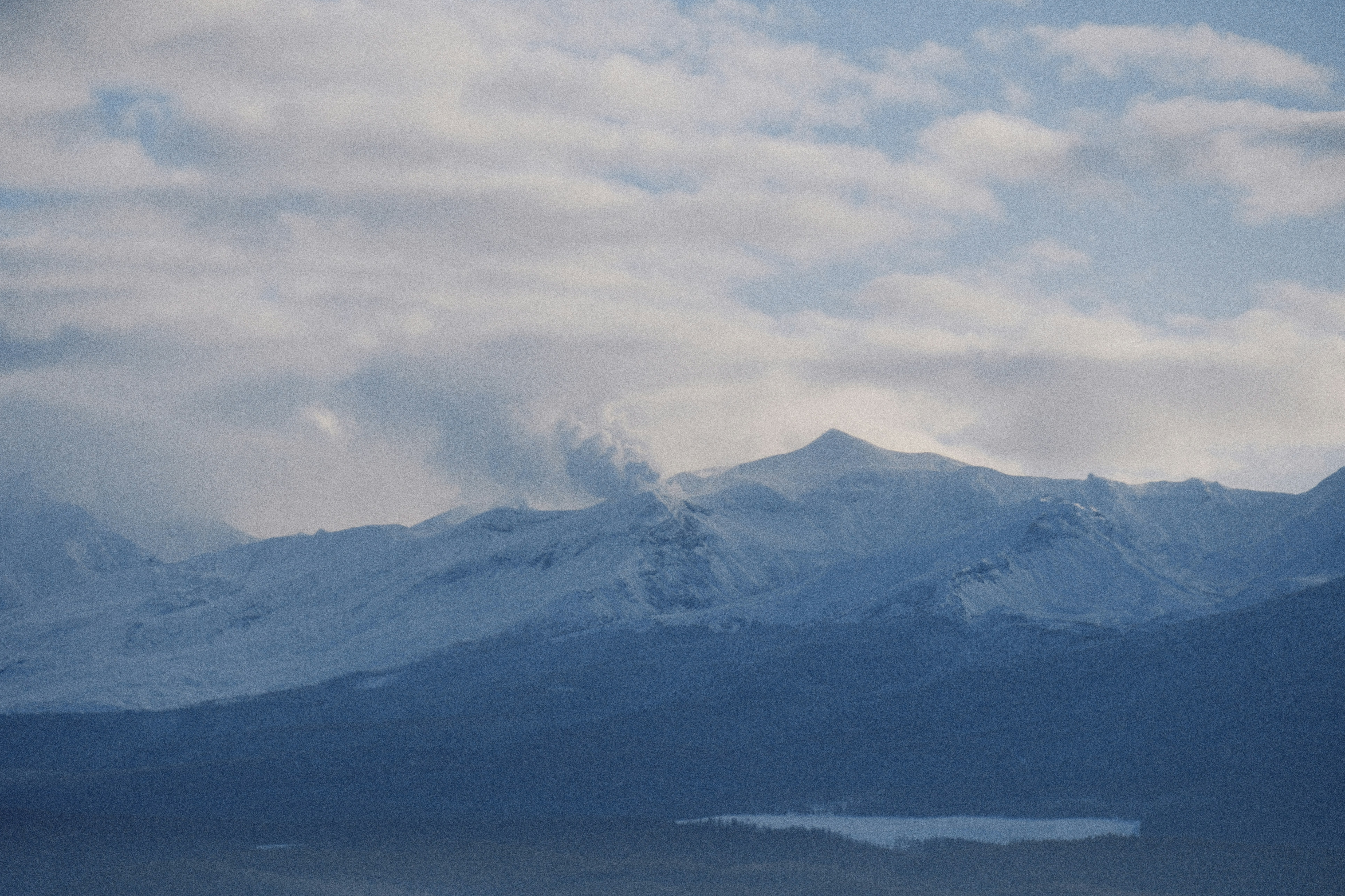 Snow-covered mountains under a cloudy sky