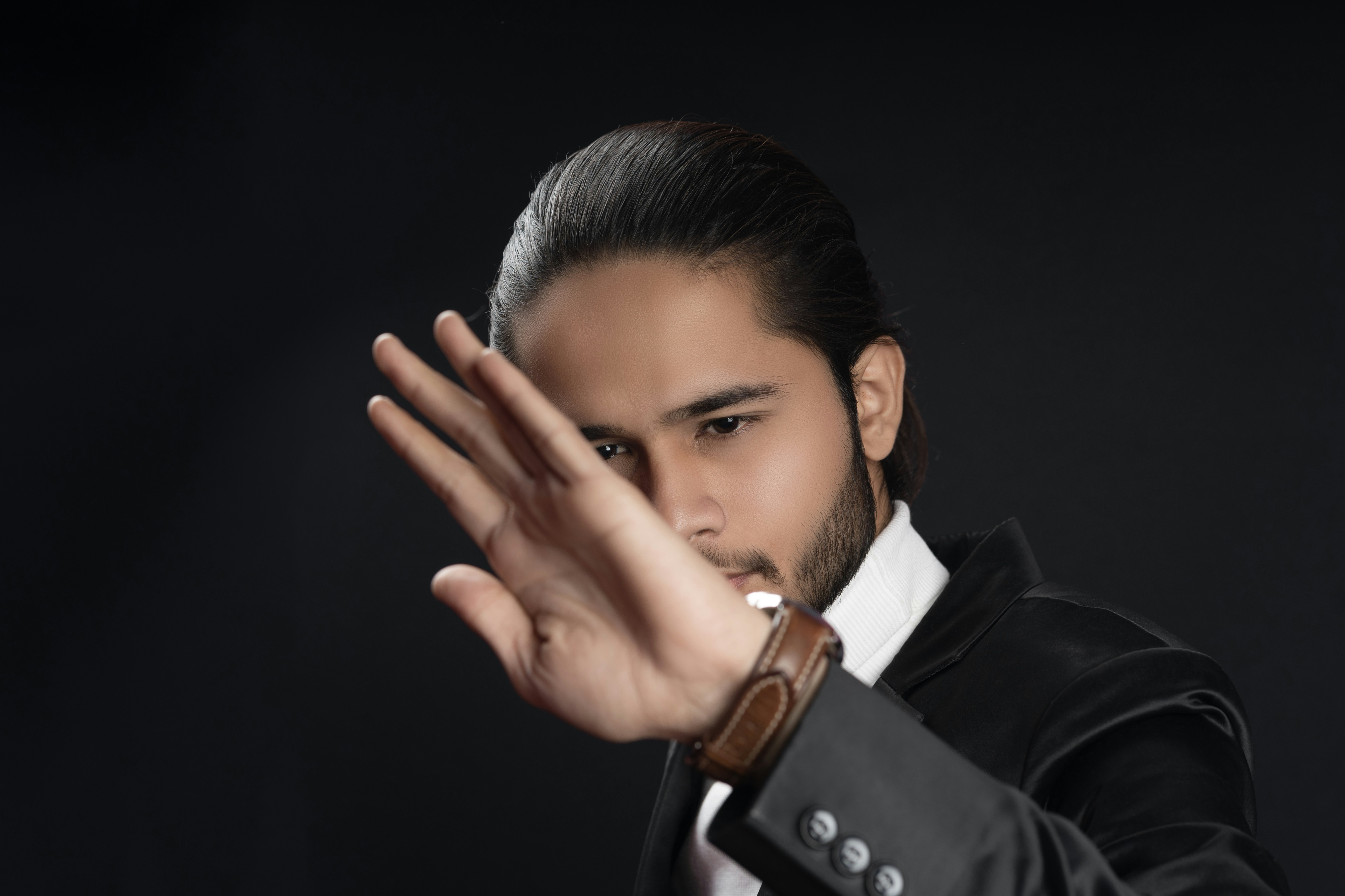 a man in a tuxedo is holding his hand up