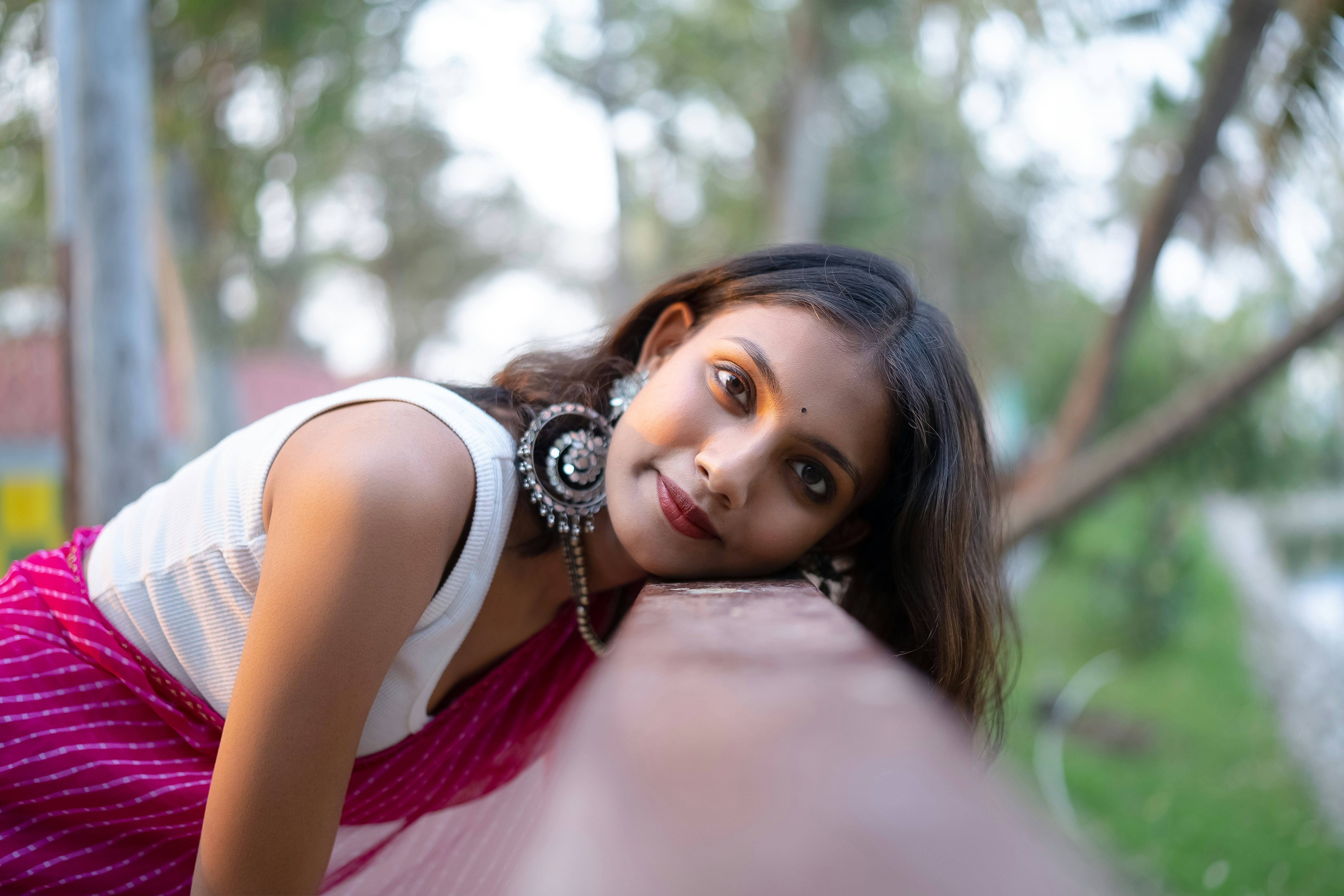 A woman leans, gazing at the camera.