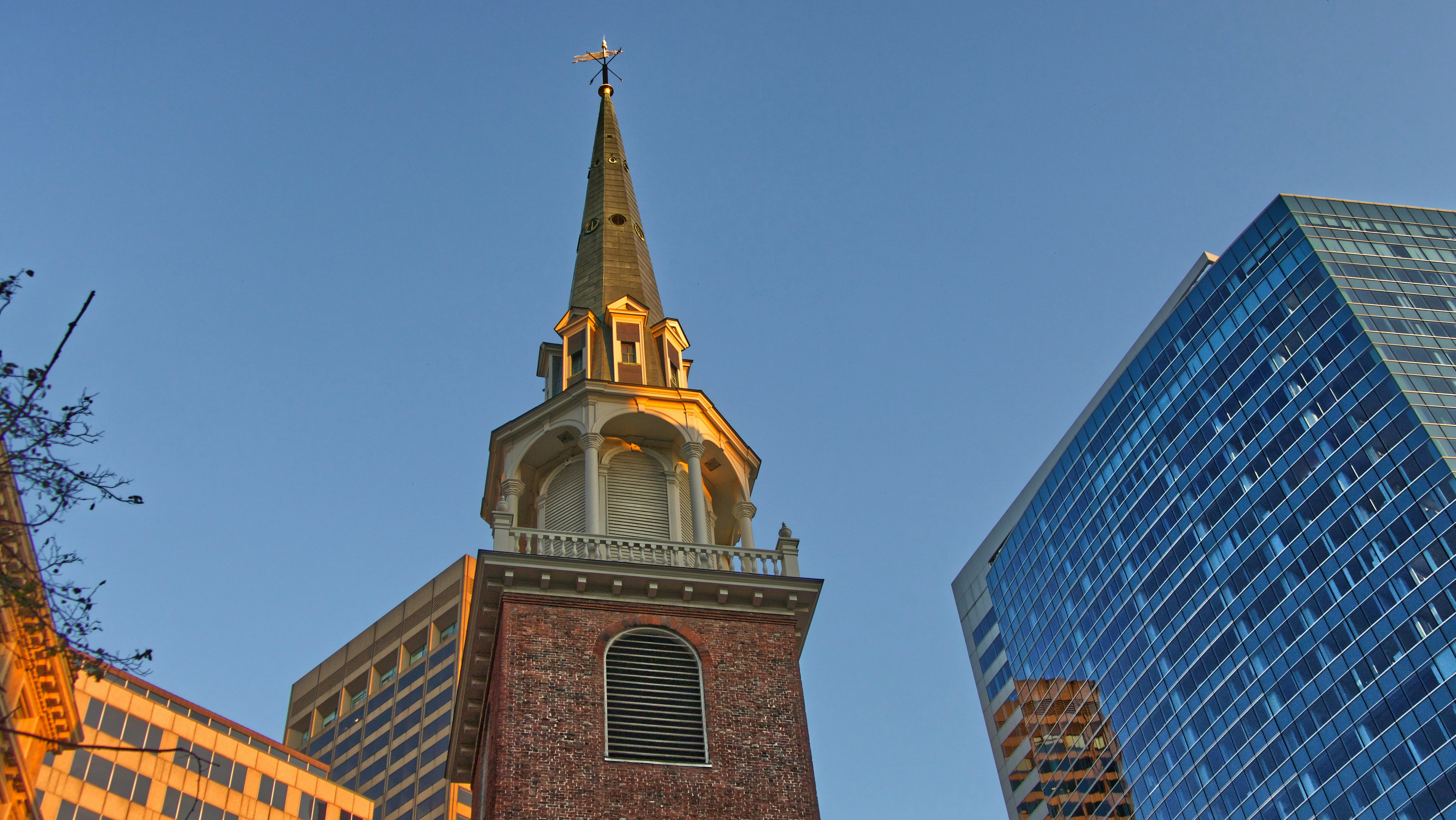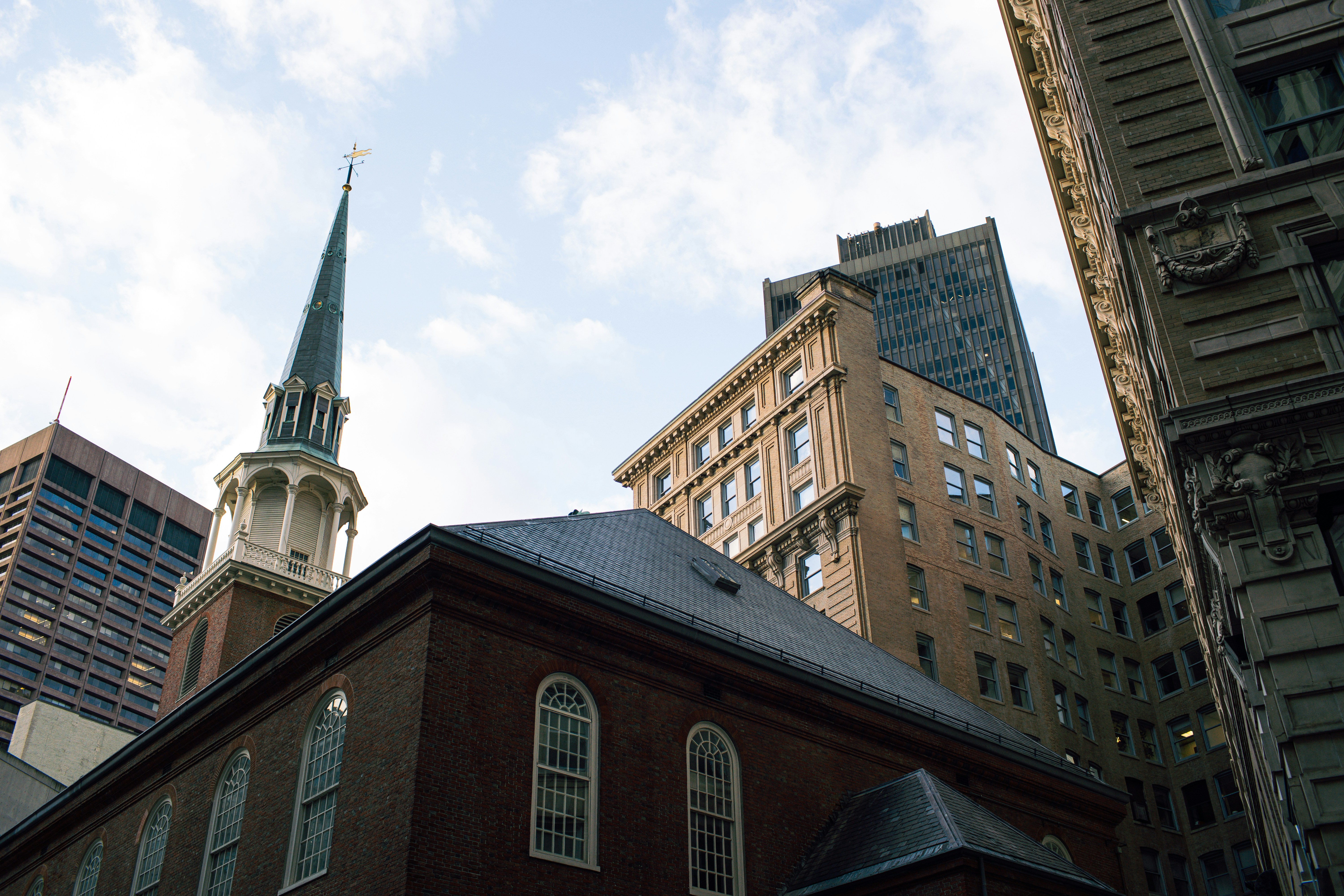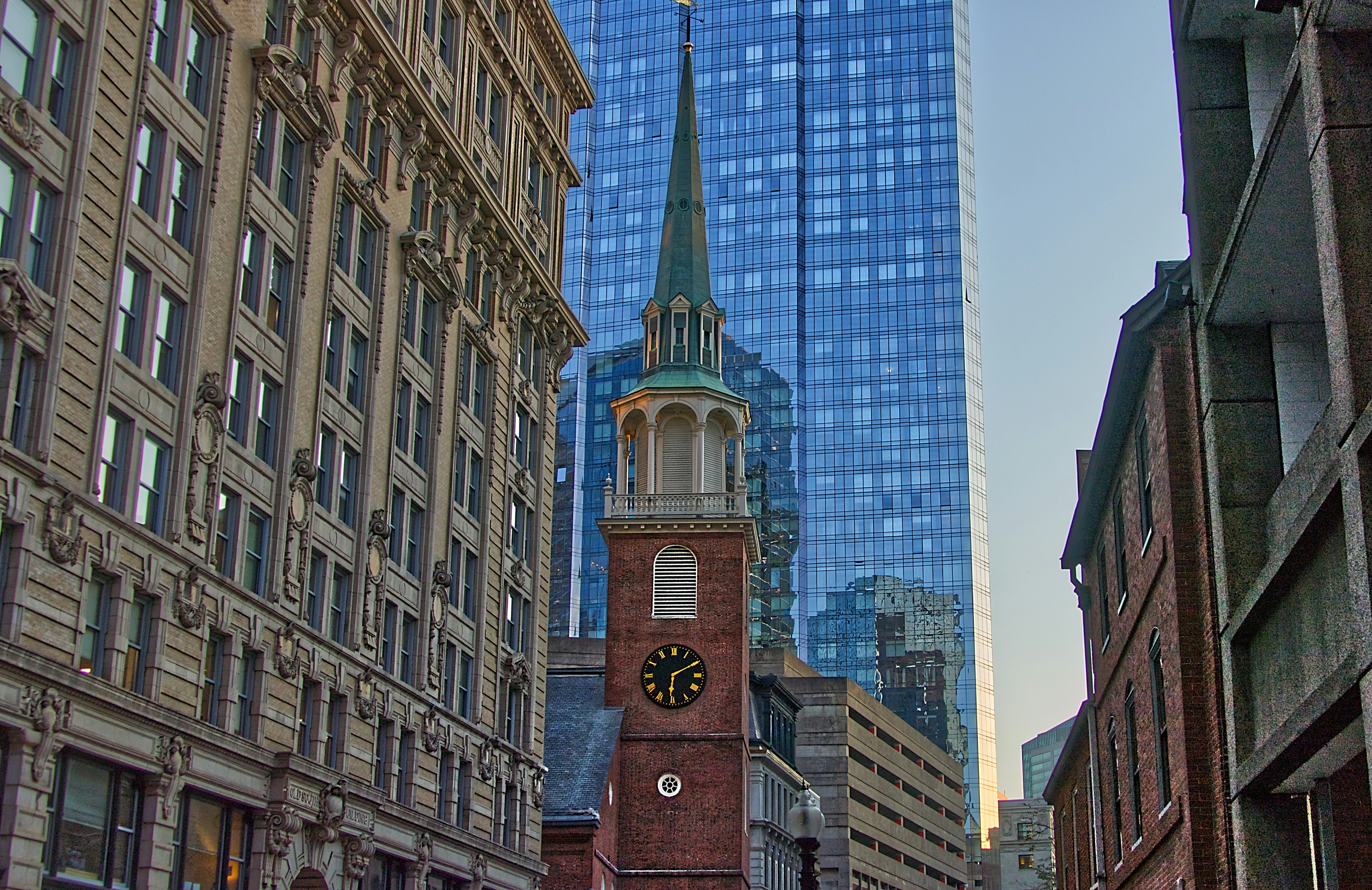 A view of downtown Boston's business district from the 33 Arch Street high-rise. The urban architecture is a mix of traditional building, 70s and 80s design, as well as modern styles.