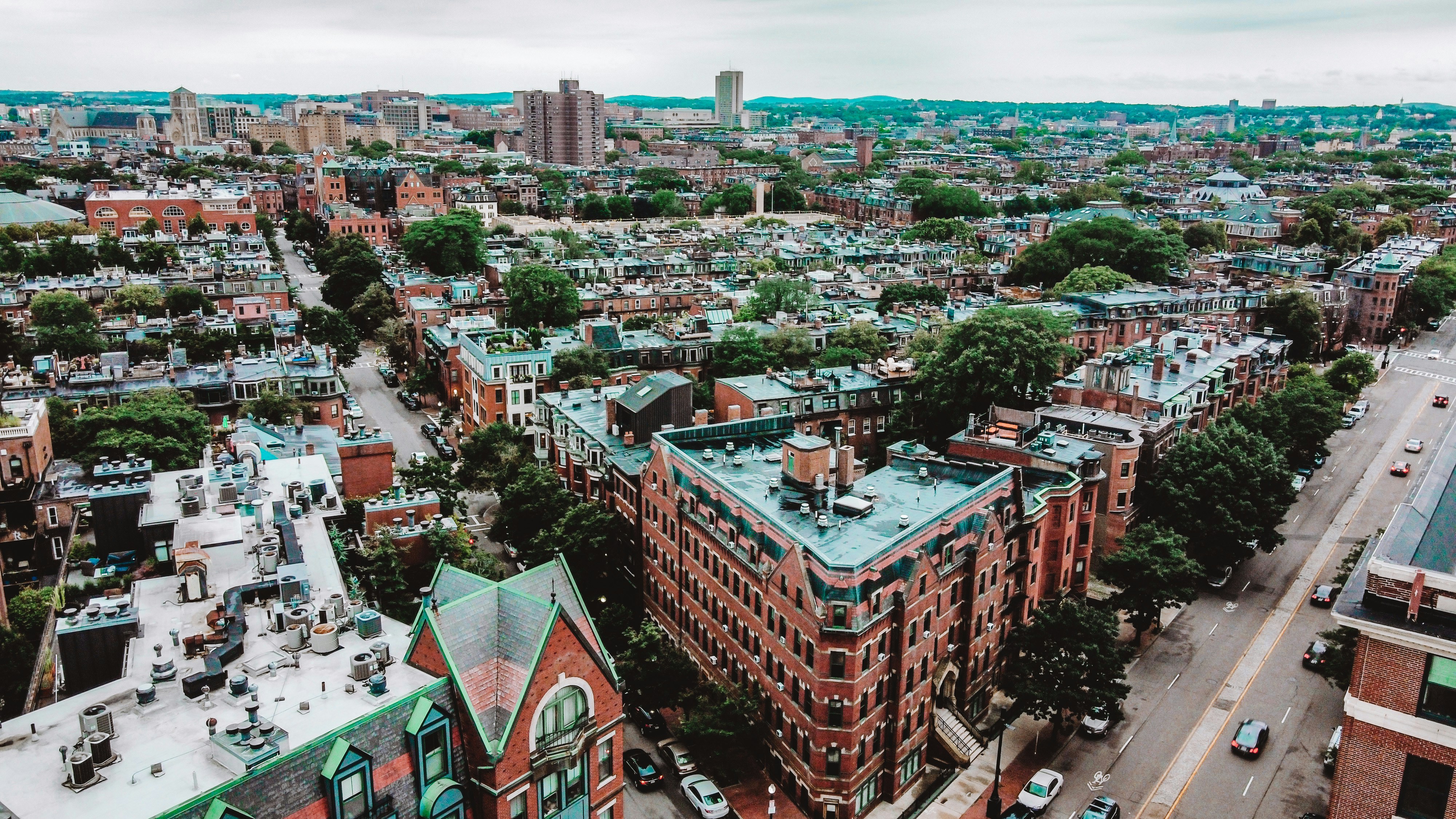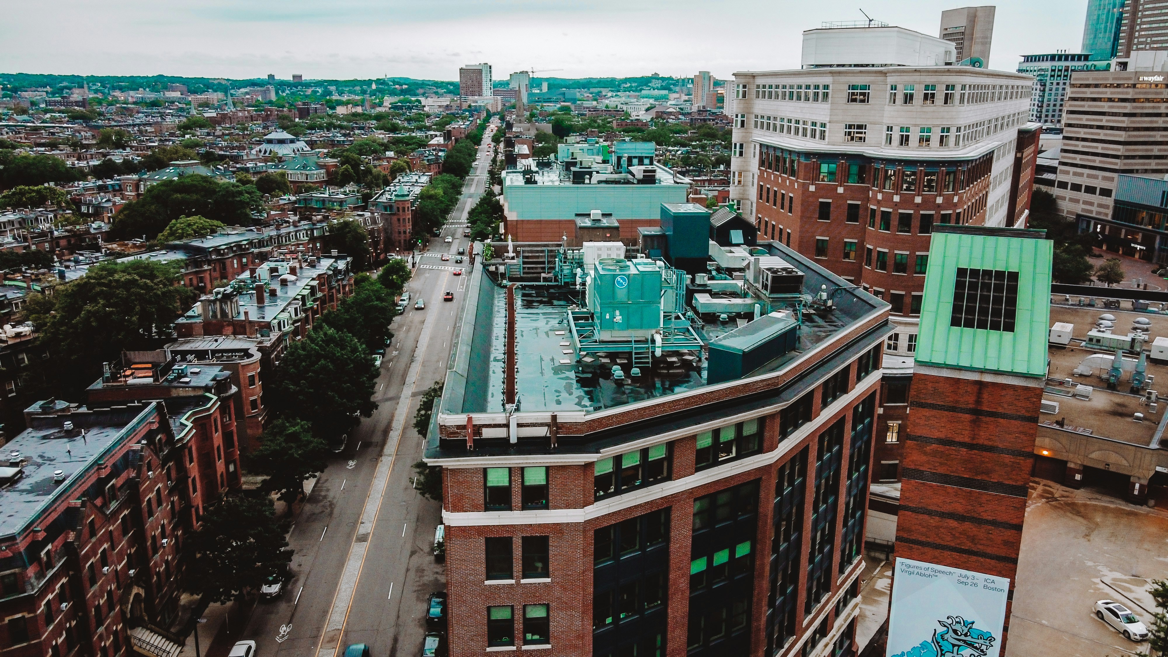 Drone photo of buildings in Back Bay, South Boston, MA near orange line station