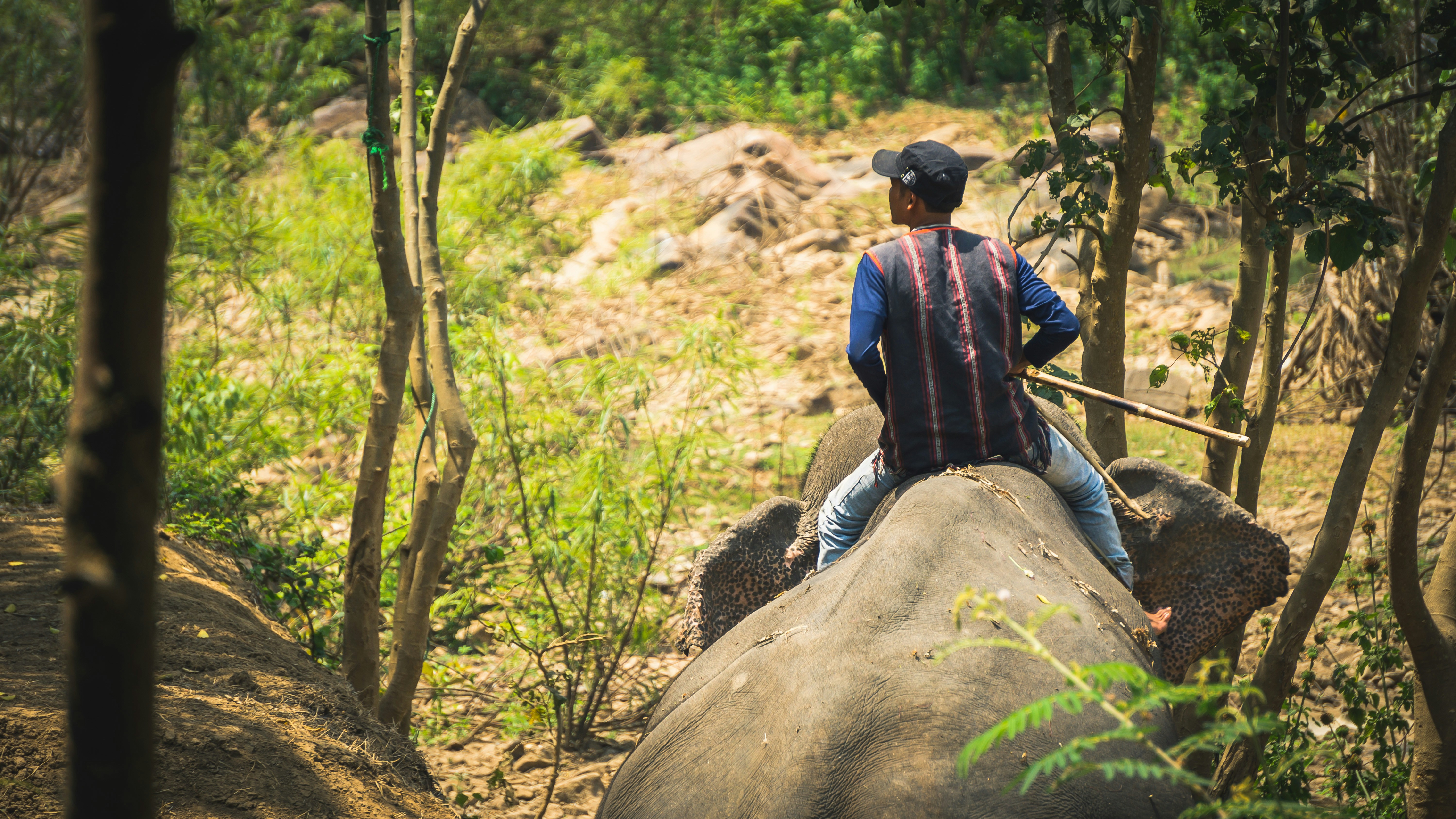 a man riding on the back of an elephant through a forest