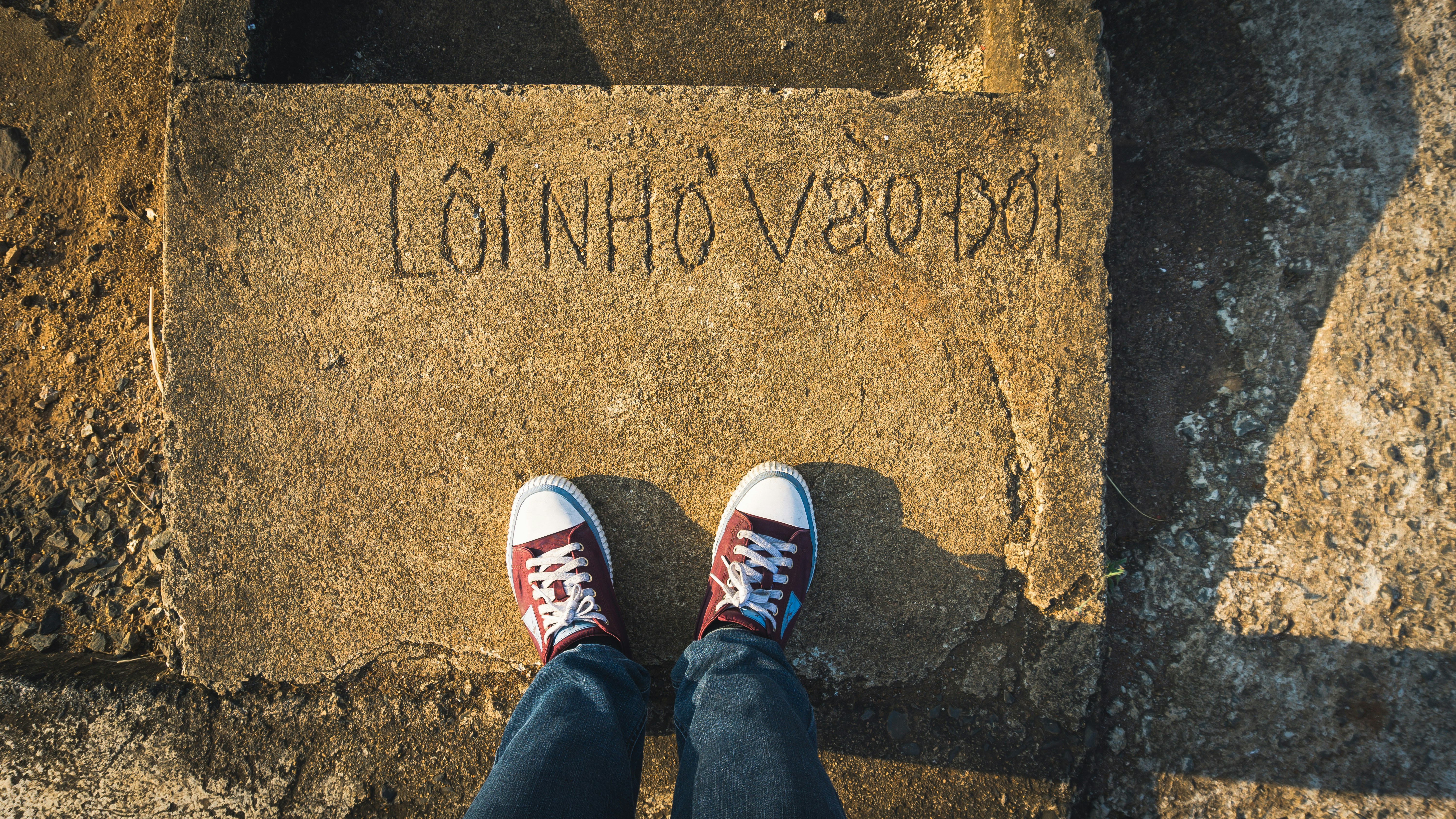 a person standing on a sidewalk with their feet up