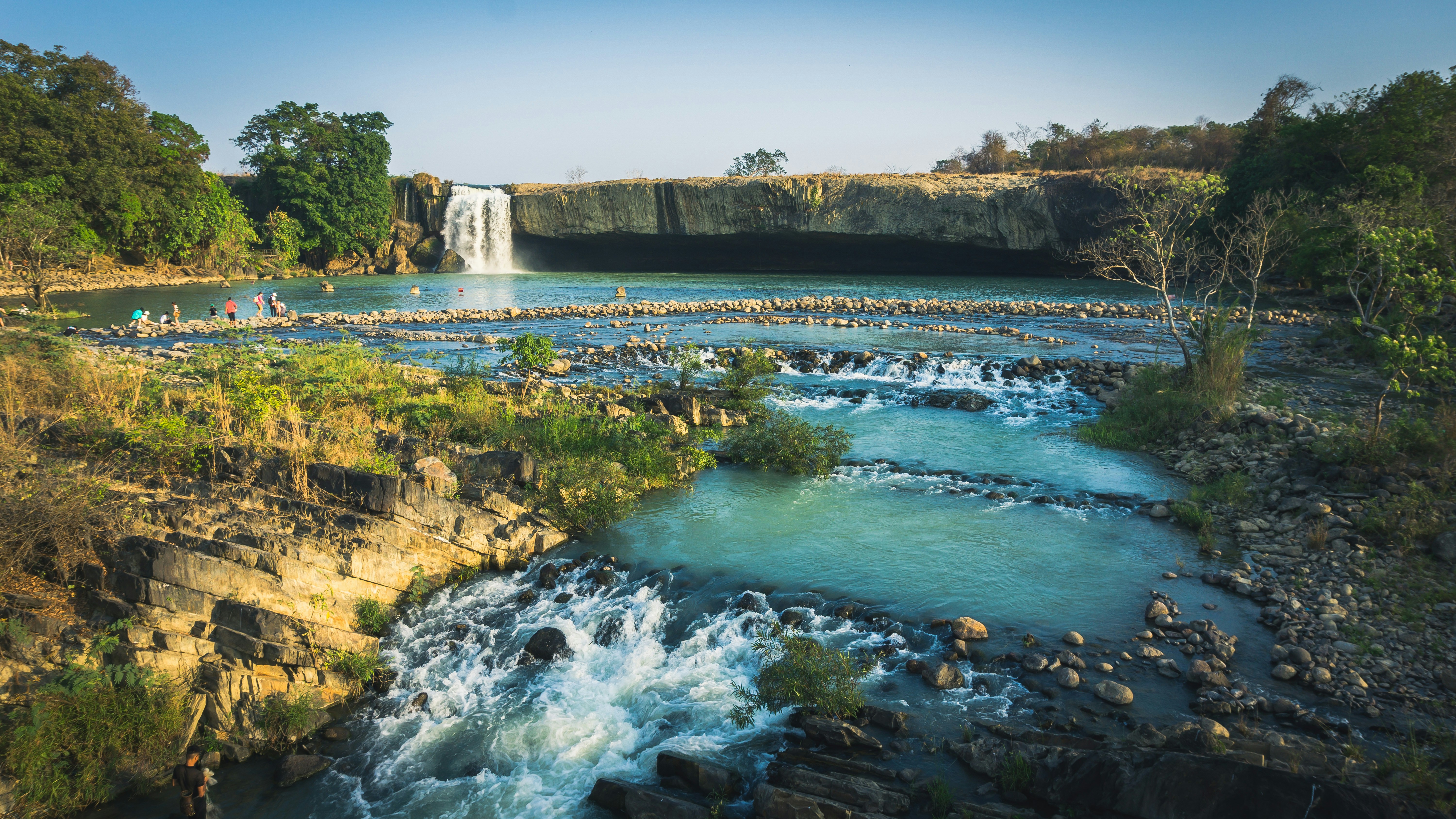 a river with a waterfall in the background