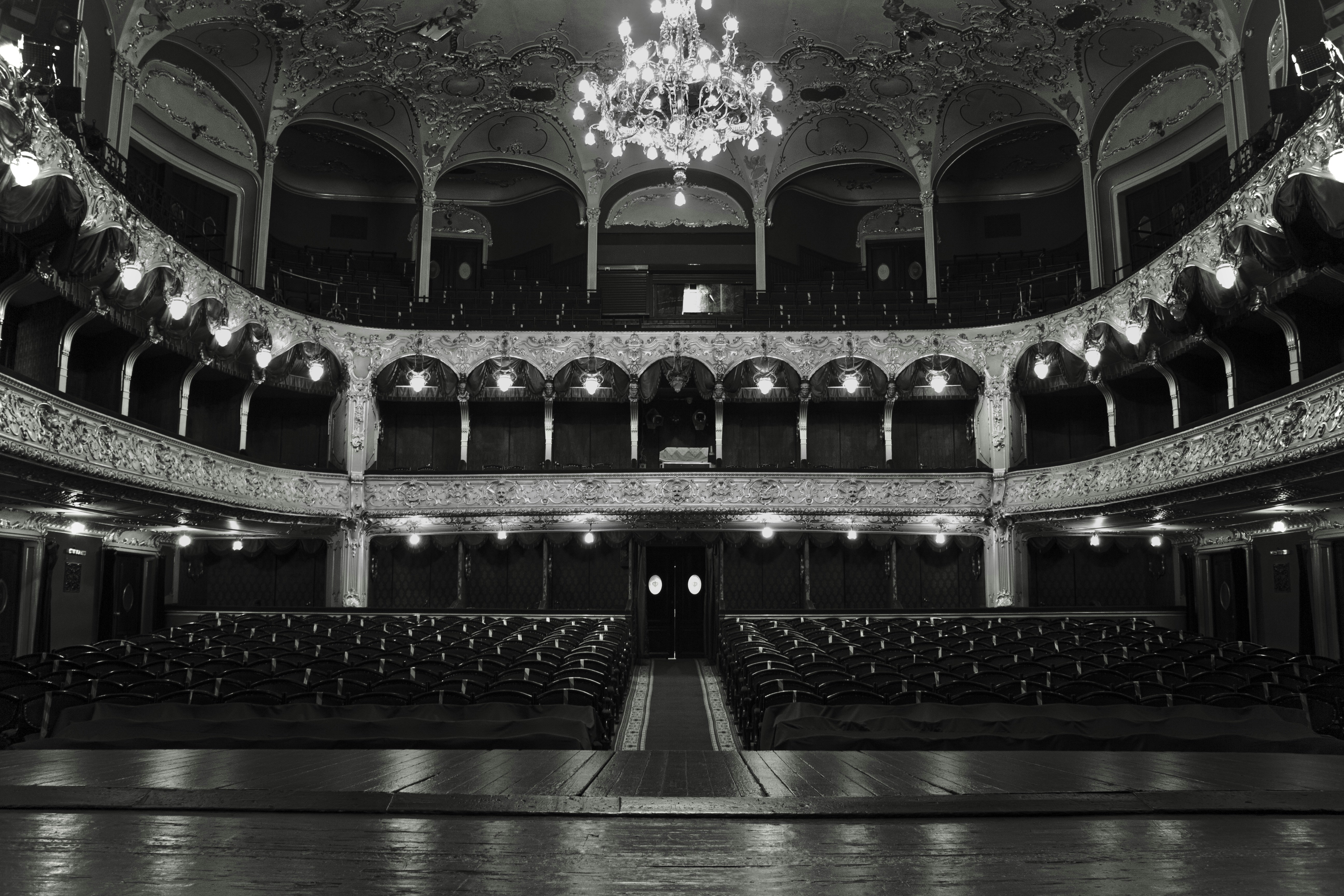a black and white photo of a large auditorium