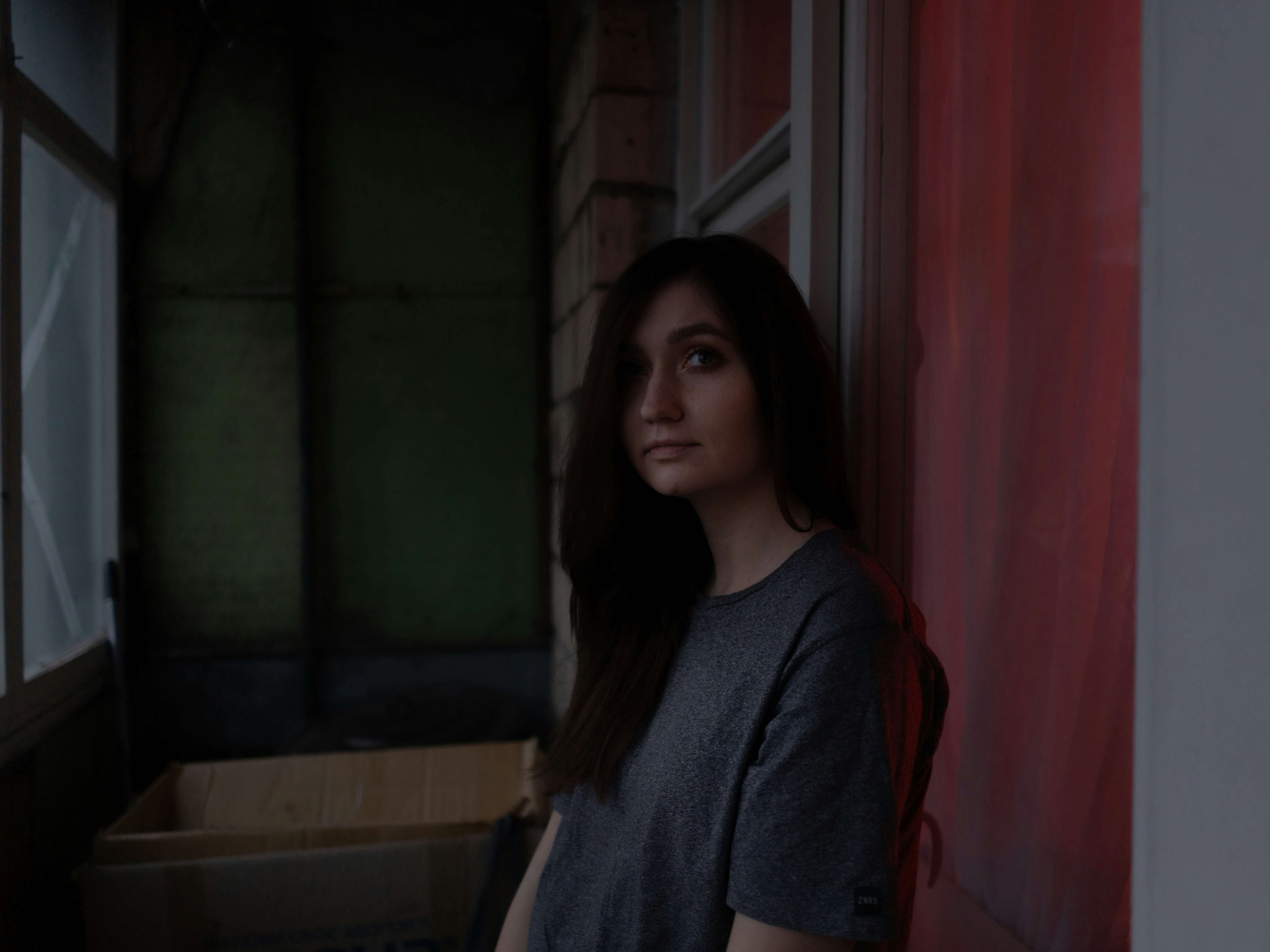 a woman standing next to a window in a room