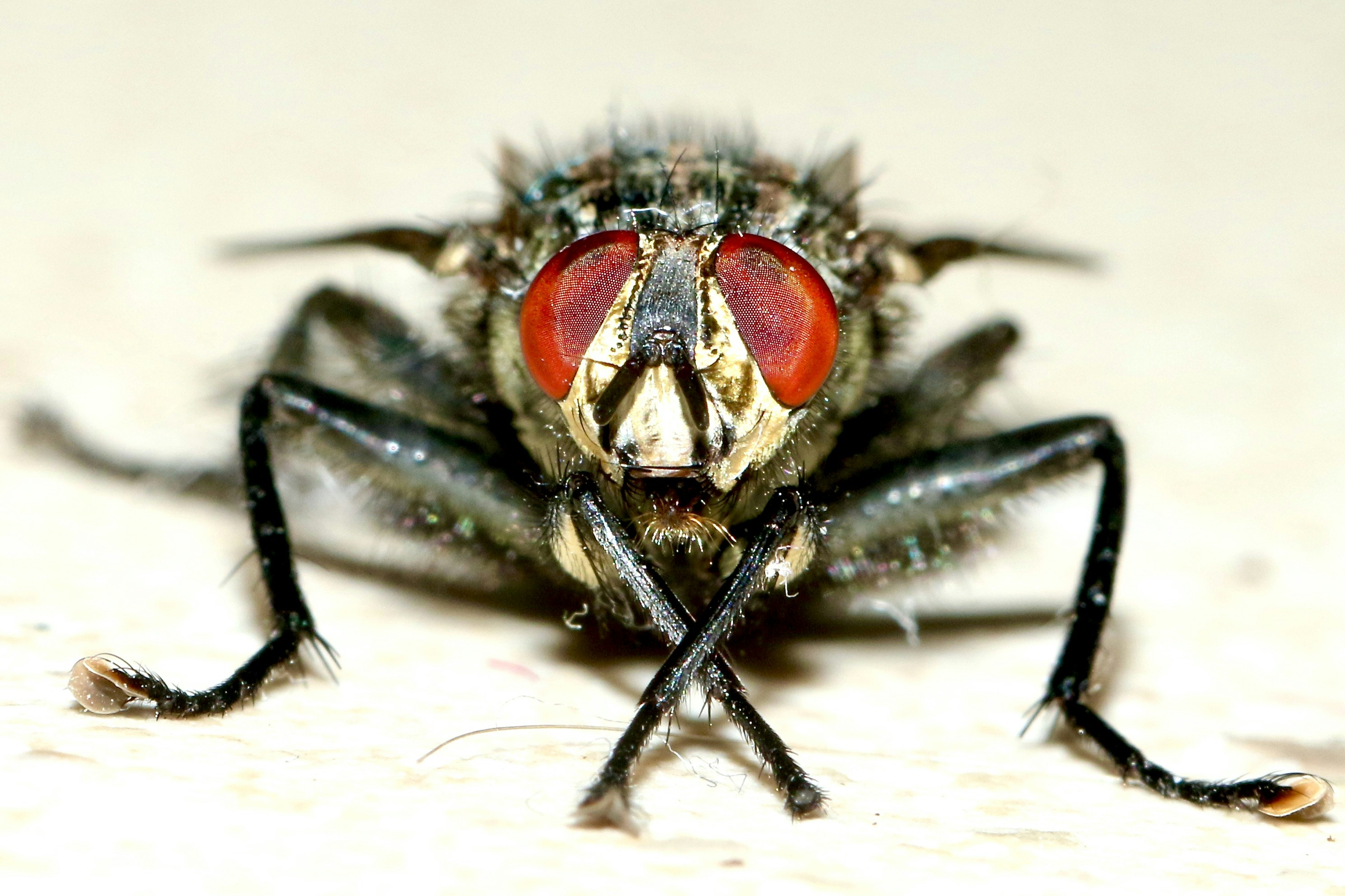 a close up of a fly on a white surface