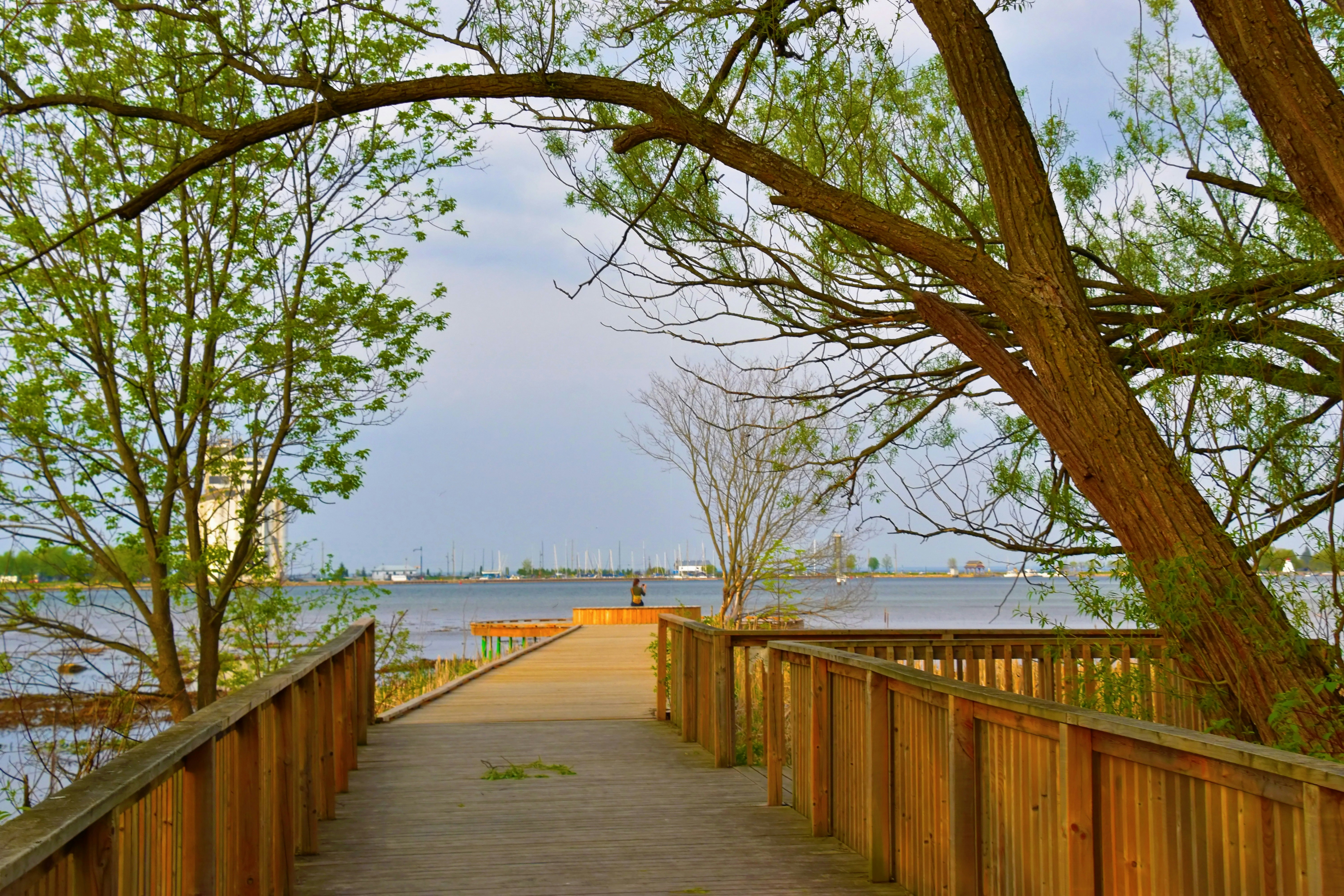 a wooden walkway leading to a body of water