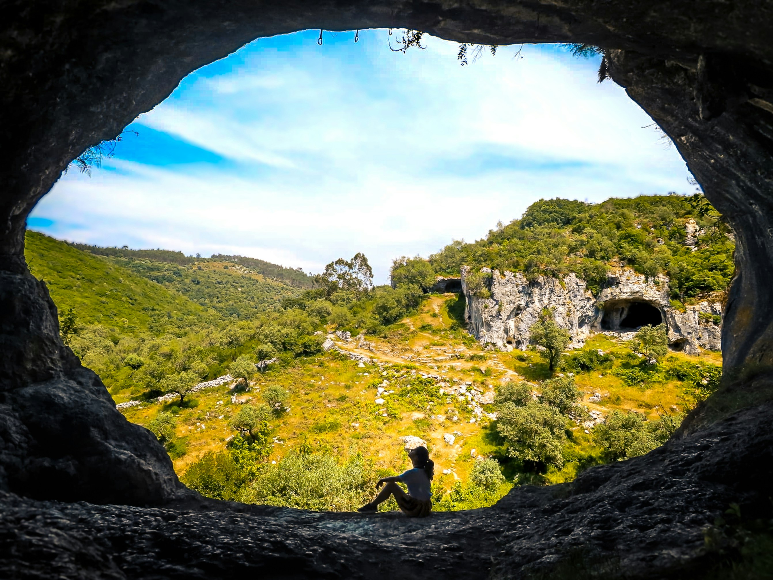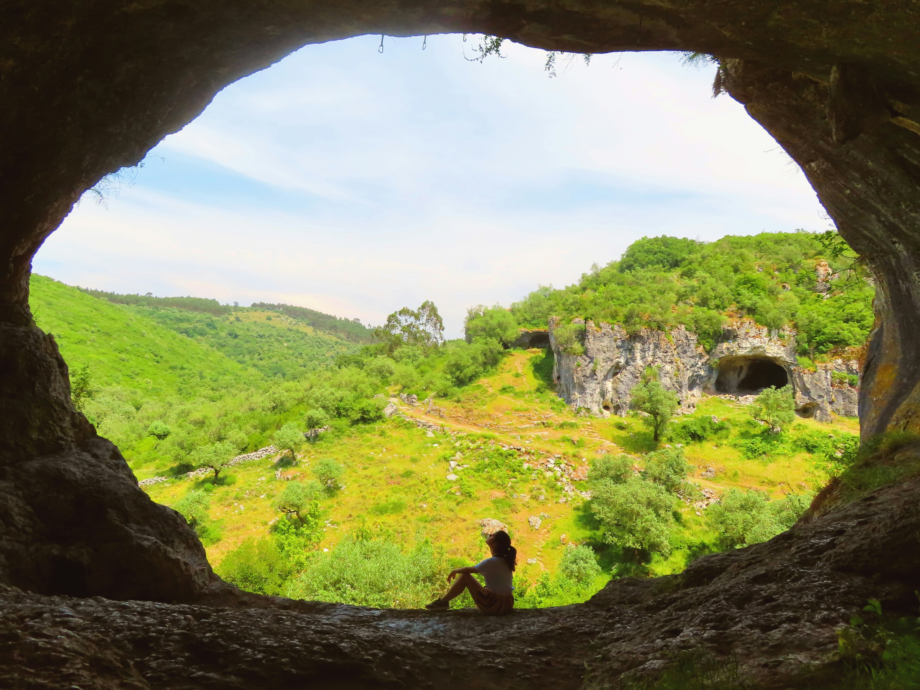 Girl sitting at the entrance of a cave in the middle of the nature in Portugal. Alternative editing of previous version
