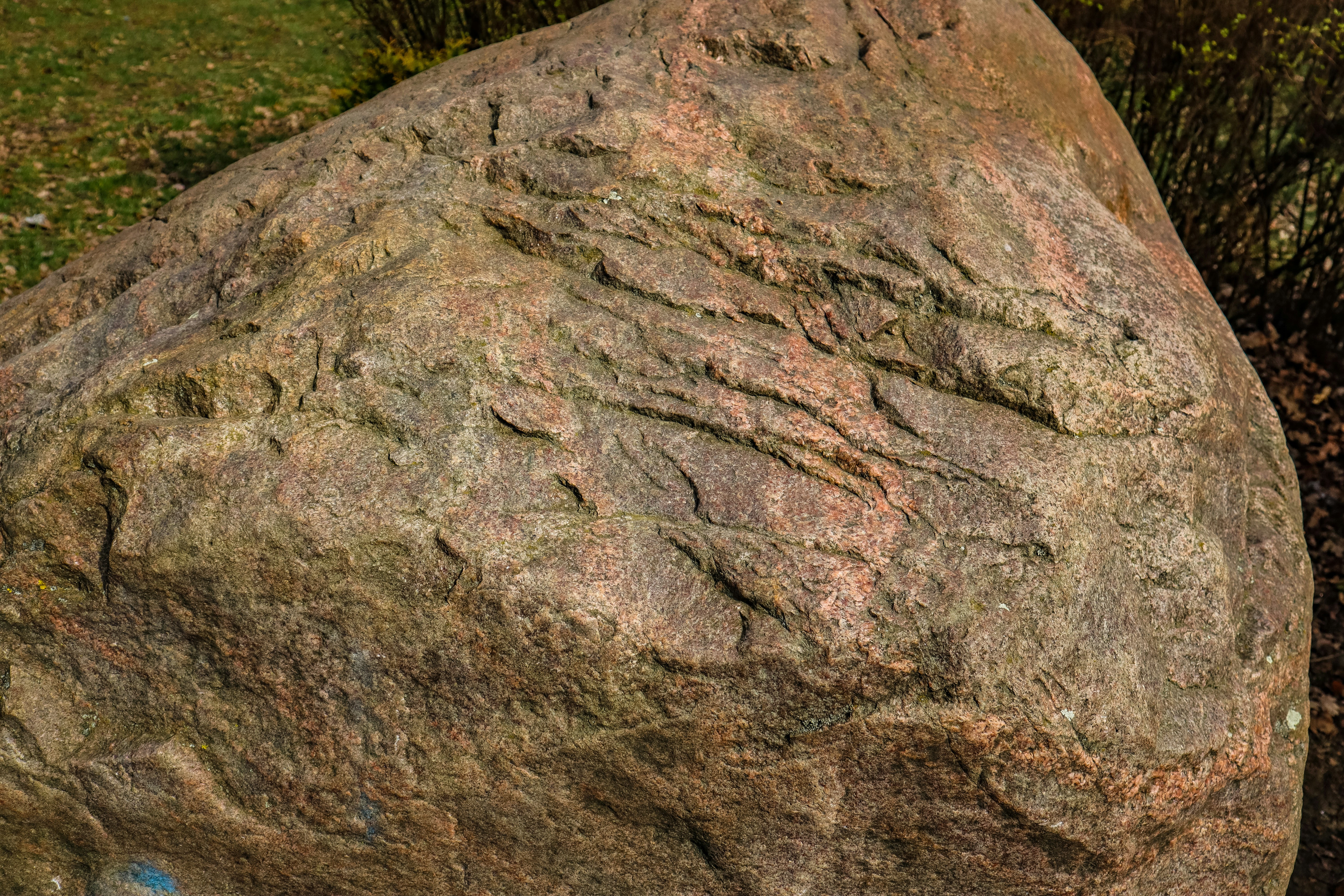 a large rock sitting on top of a lush green field