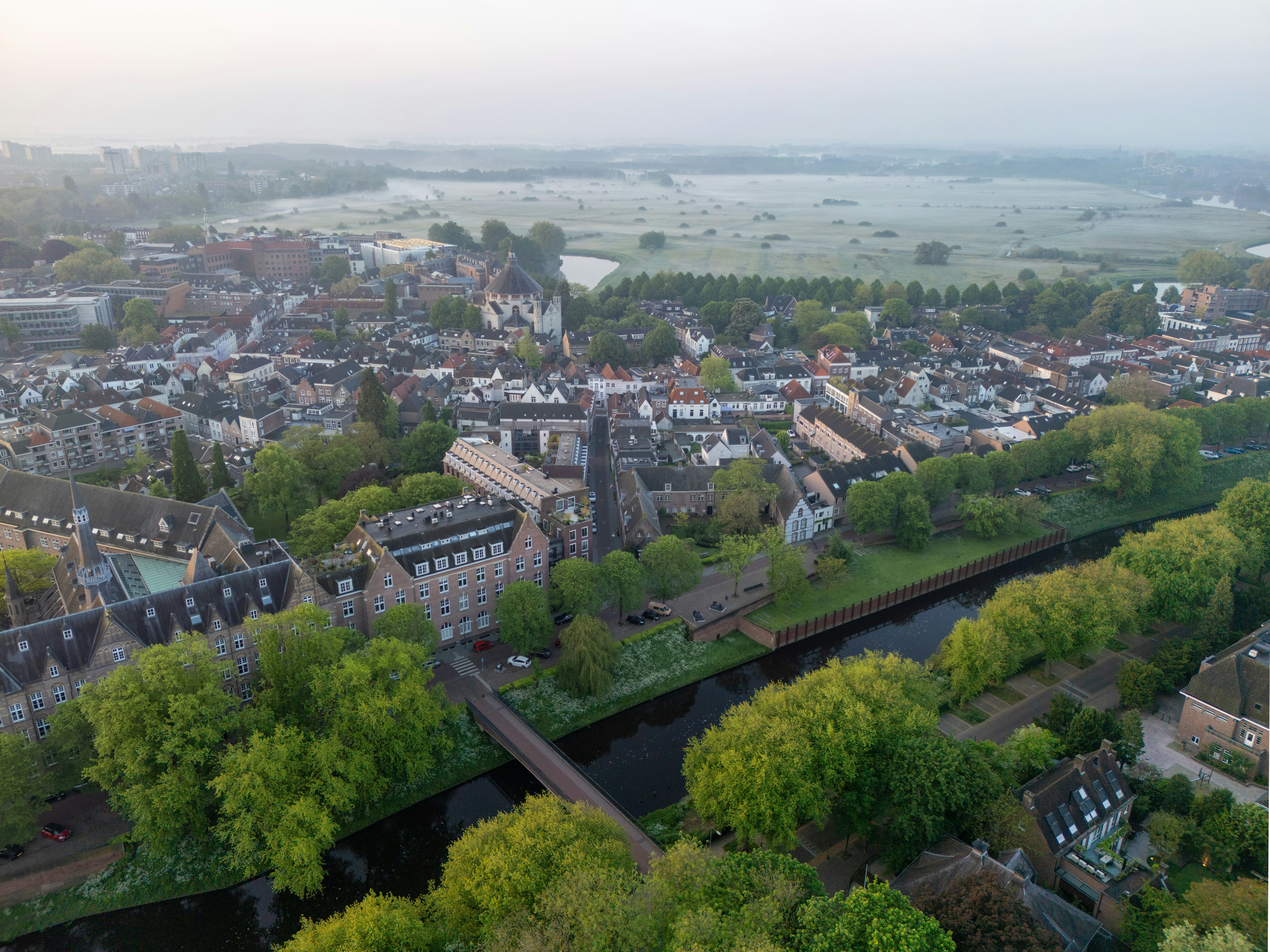 Aerial view of tranquil canal, boats, and tree-lined urban neighborhood at sunrise Description: Elevated morning view of a peaceful canal bordered by moored boats, greenery, and dutch traditional architecture. The soft light and calm water highlight the orderly layout of the neighborhood and its waterfront infrastructure. Suitable for themes related to urban planning, transportation, leisure, and scenic travel.