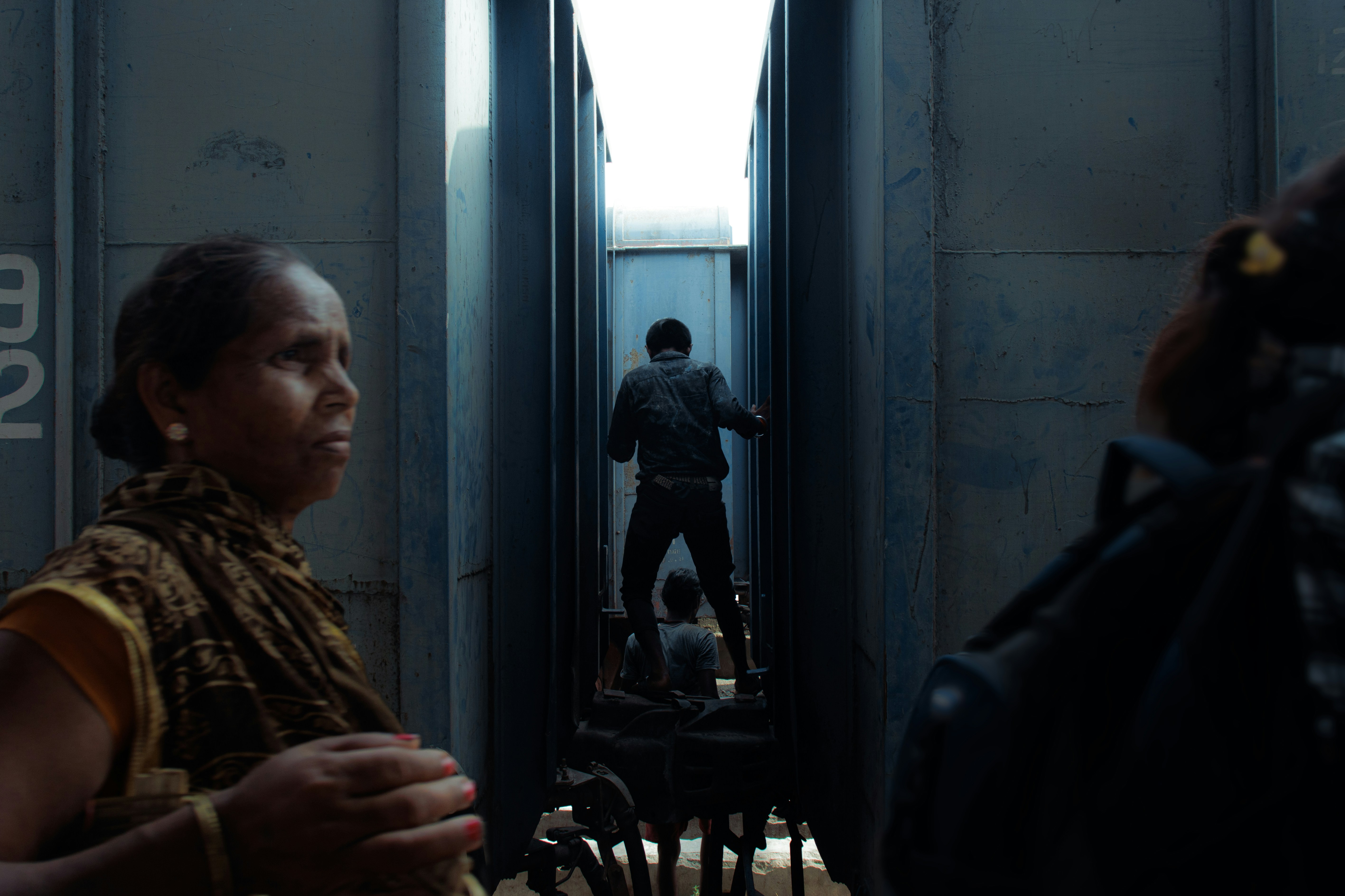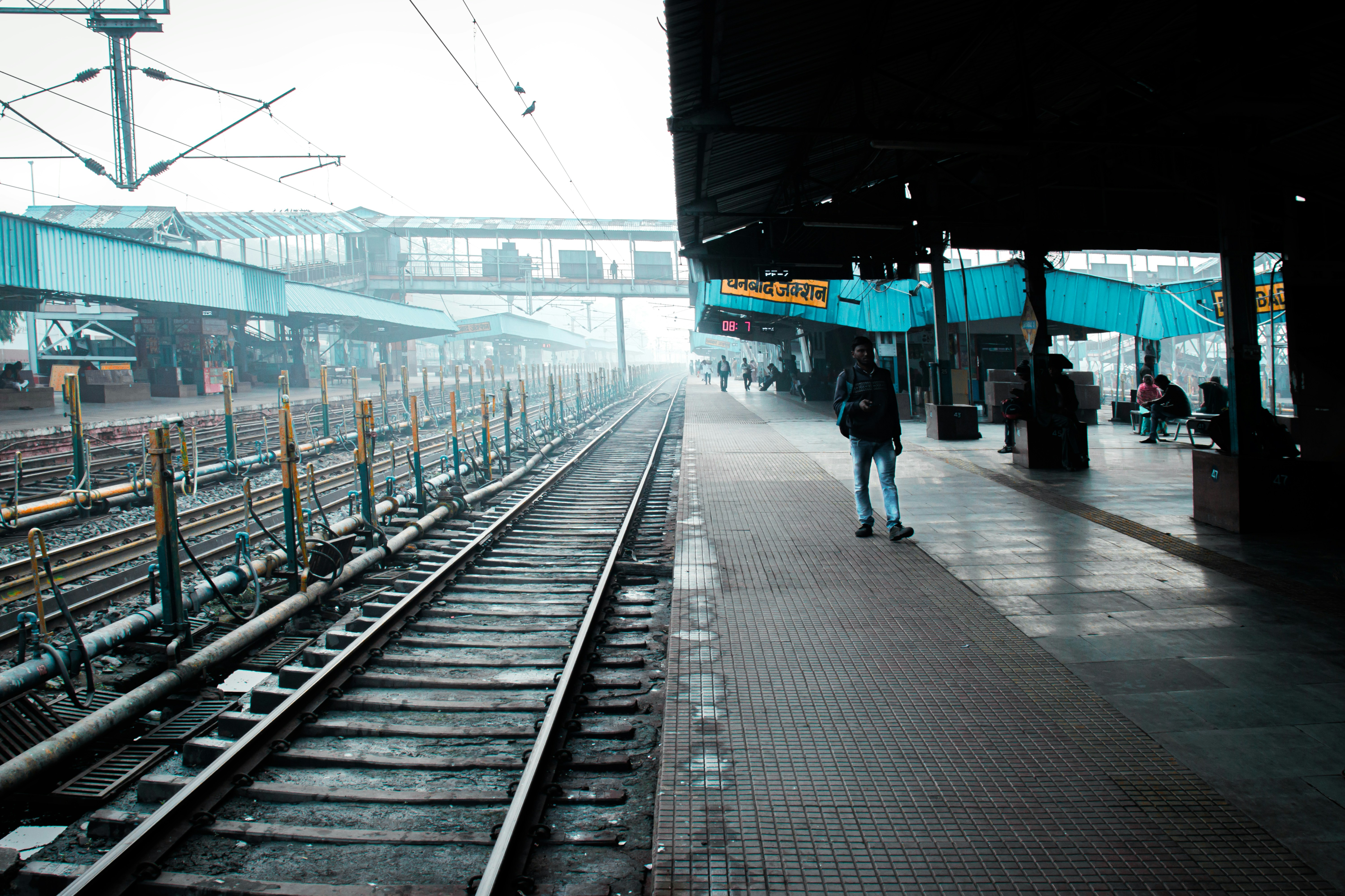 A man walking down a train track next to a train