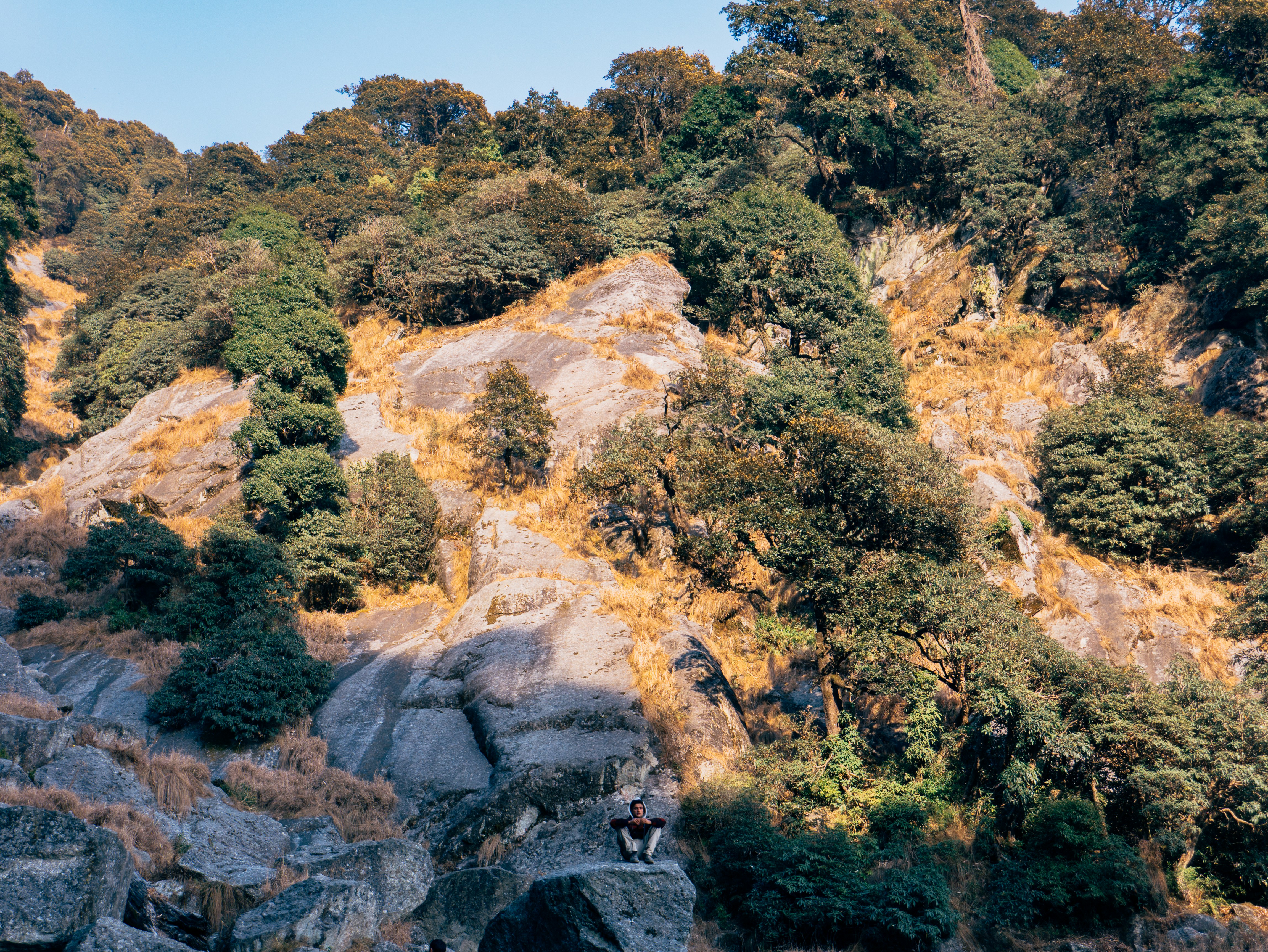 Rocky hillside is covered in lush green vegetation.