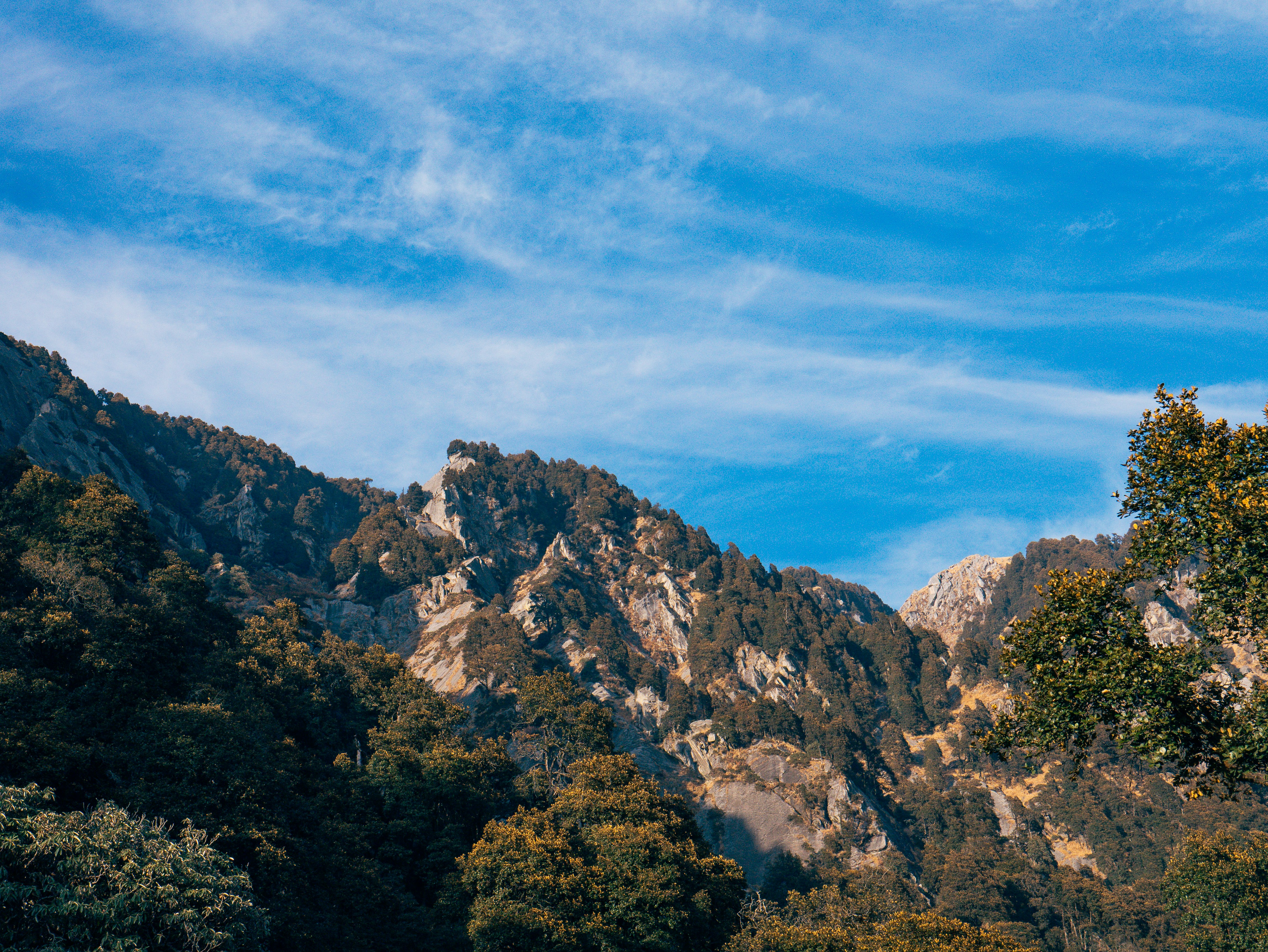 Mountains and trees sit under a bright blue sky.