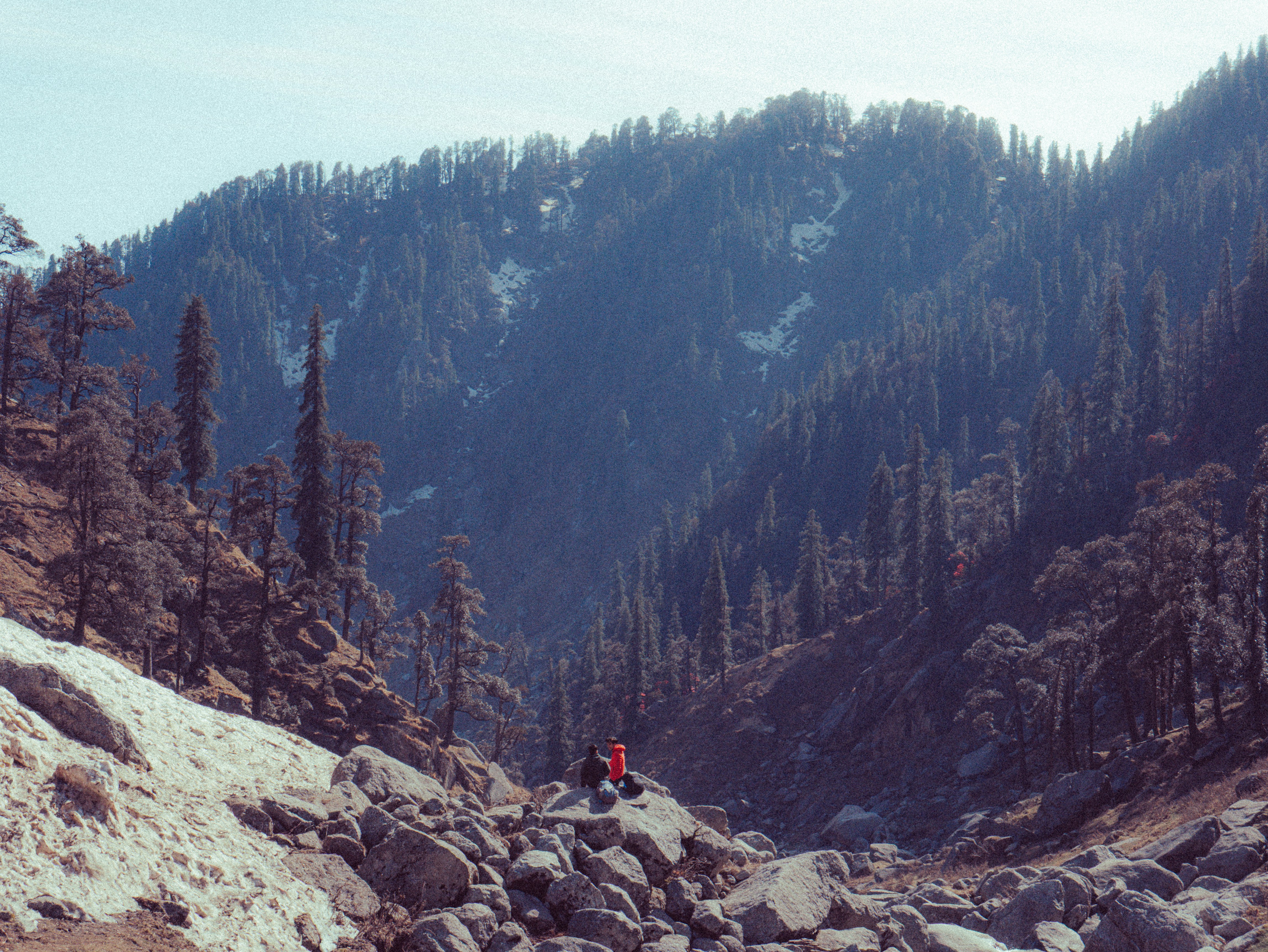 Mountains tower above a valley with trees and snow.