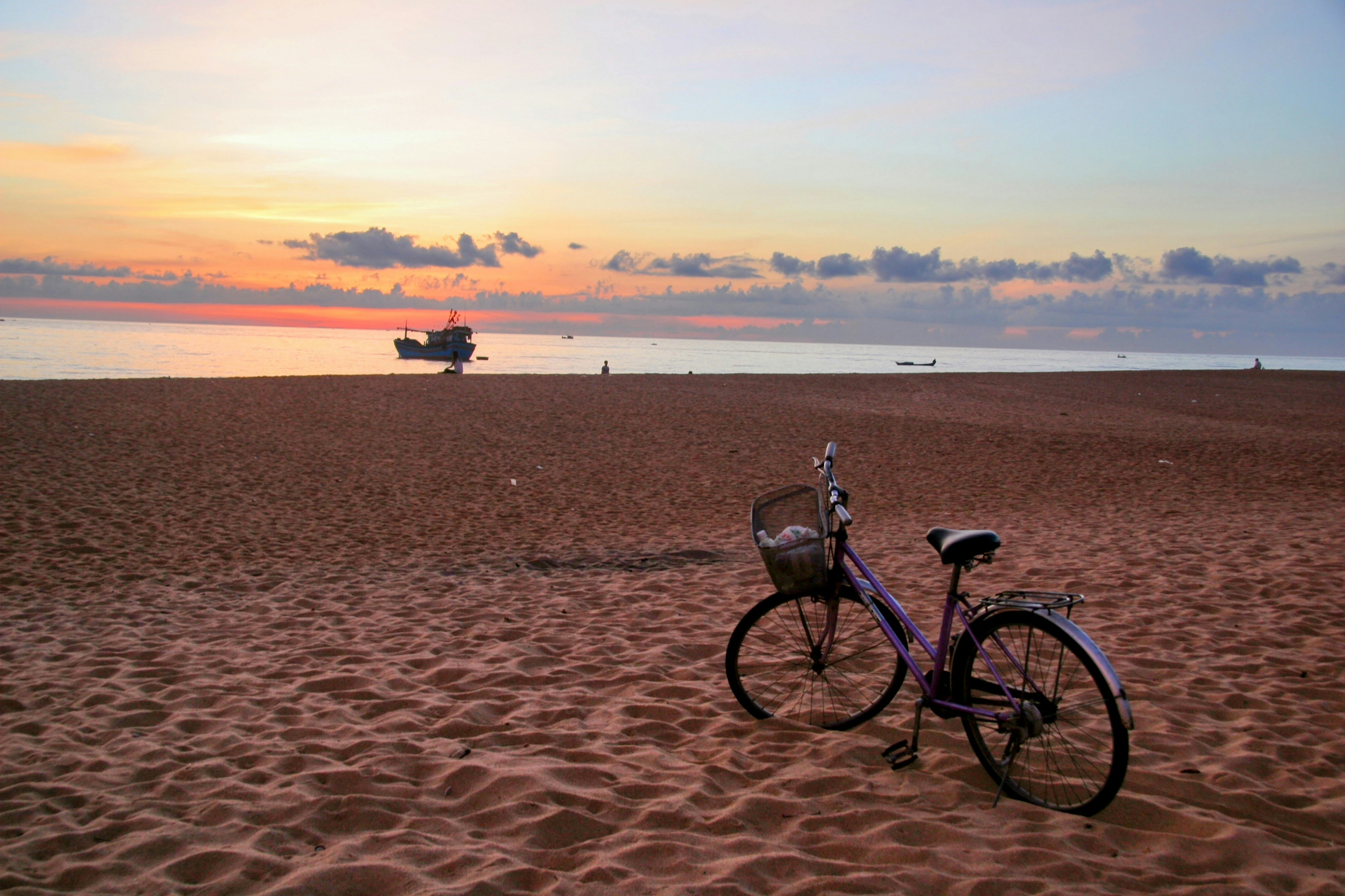 a bike parked on a beach next to the ocean