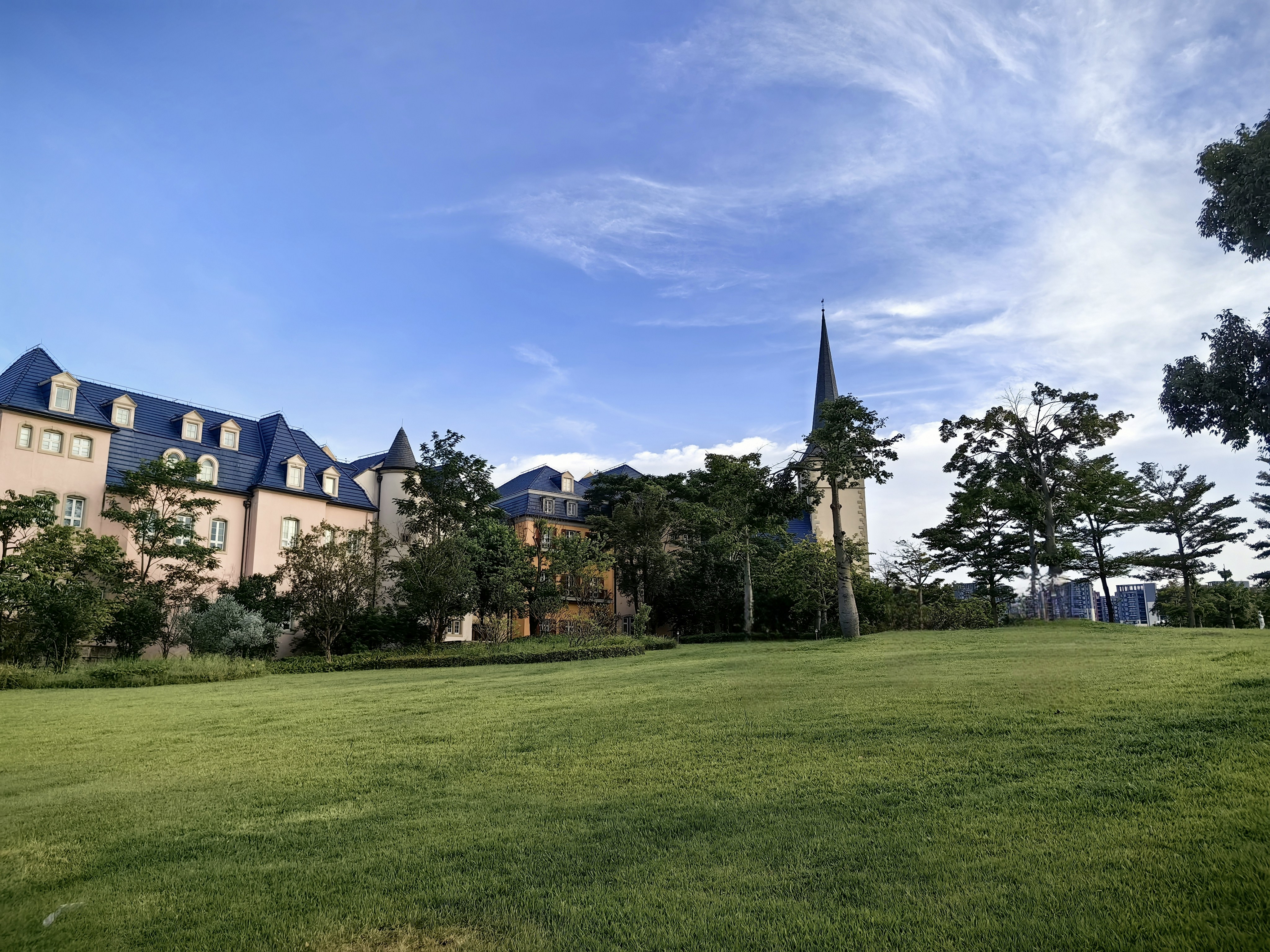 A large building sitting on top of a lush green field