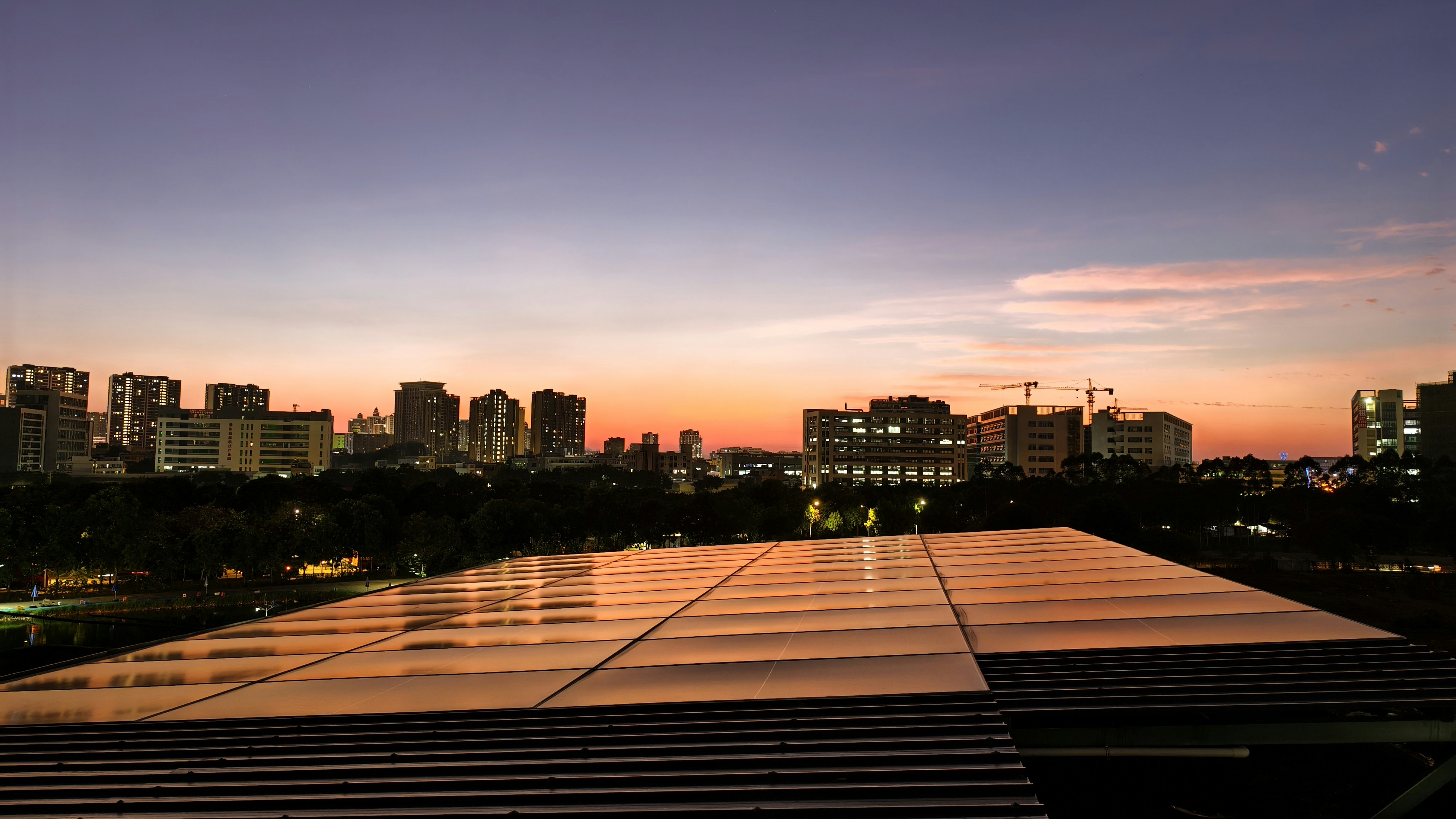 A view of a city skyline at dusk