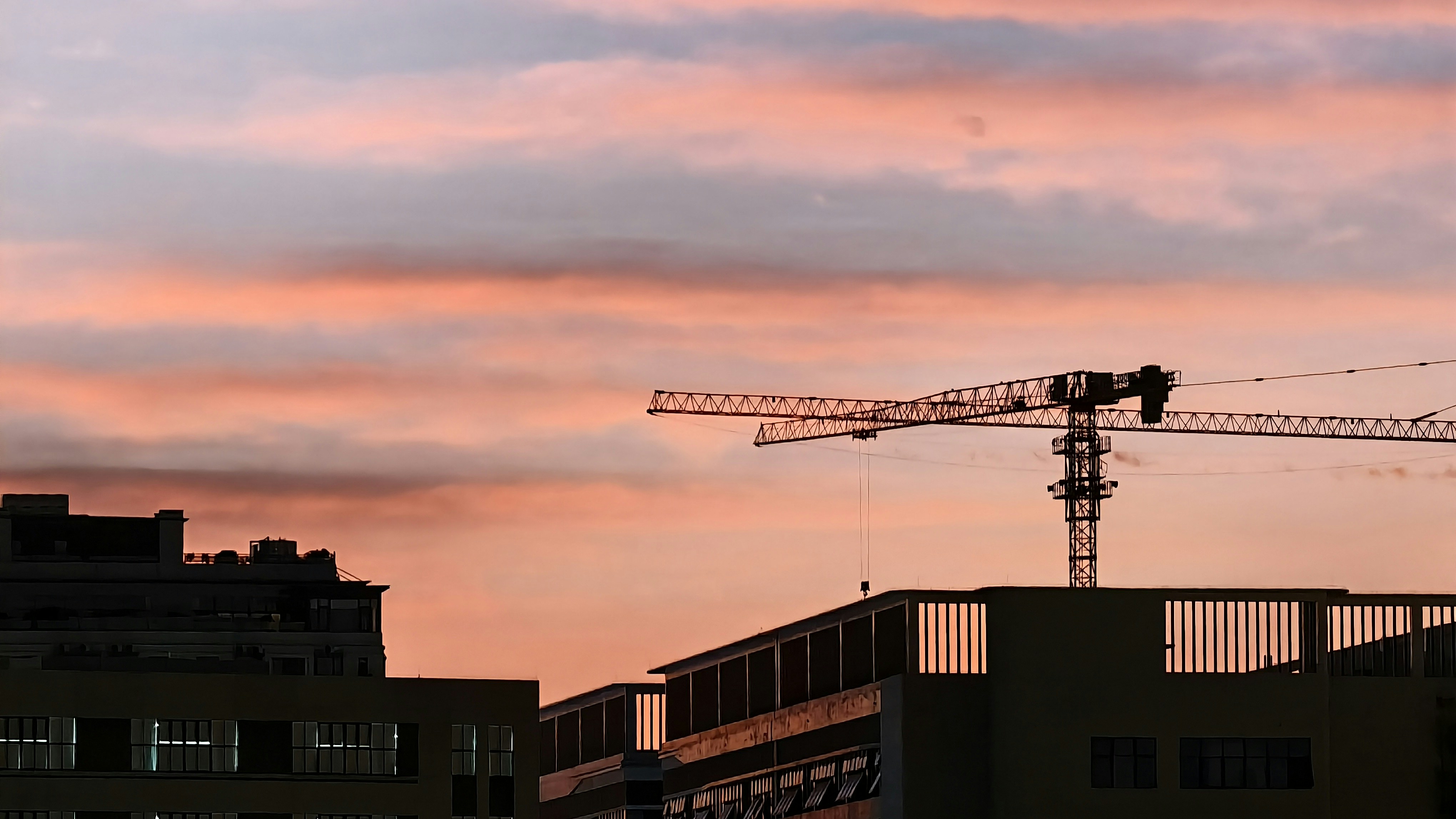 A crane is silhouetted against a pink sky