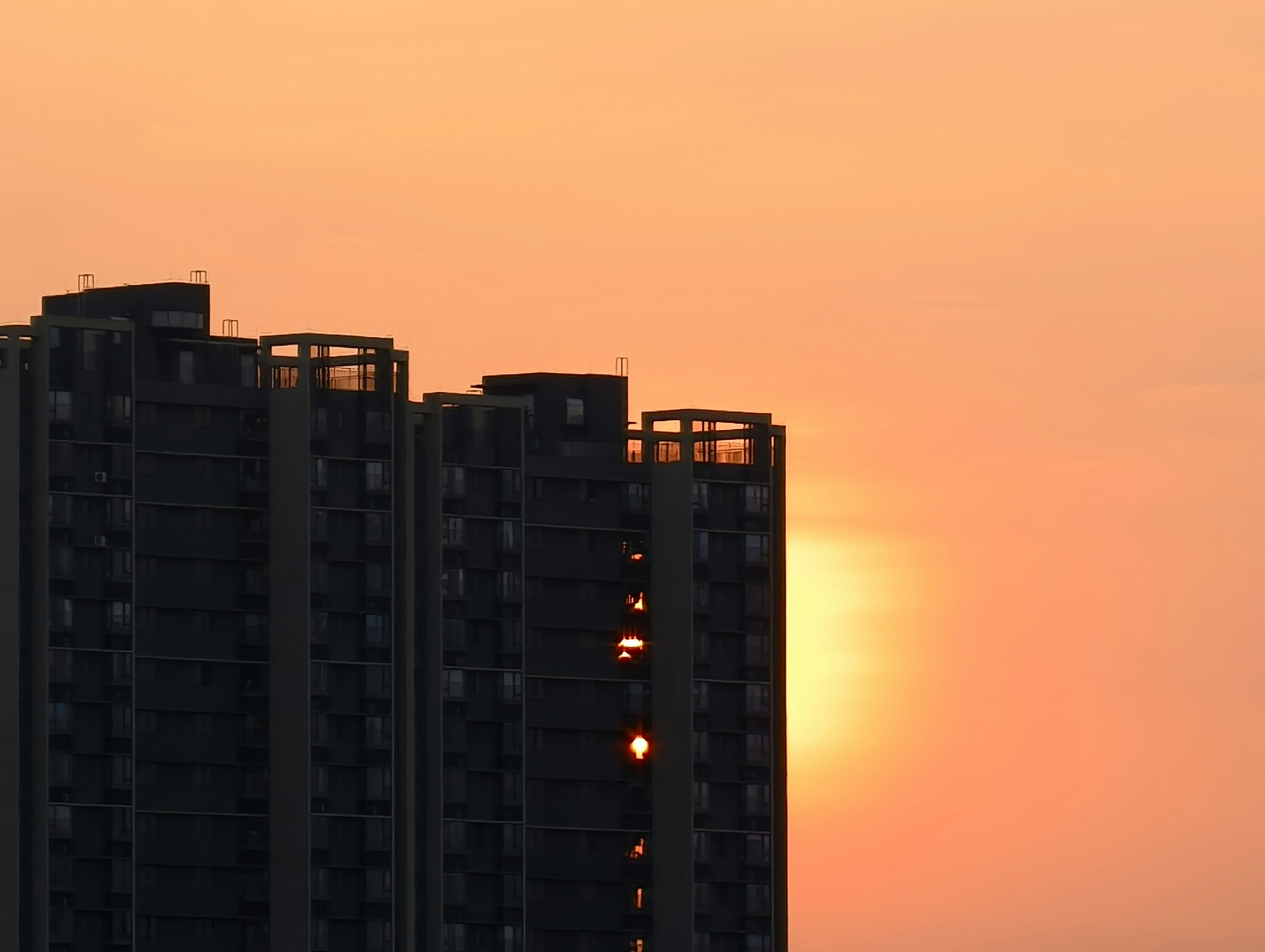 The sun is setting behind a tall building