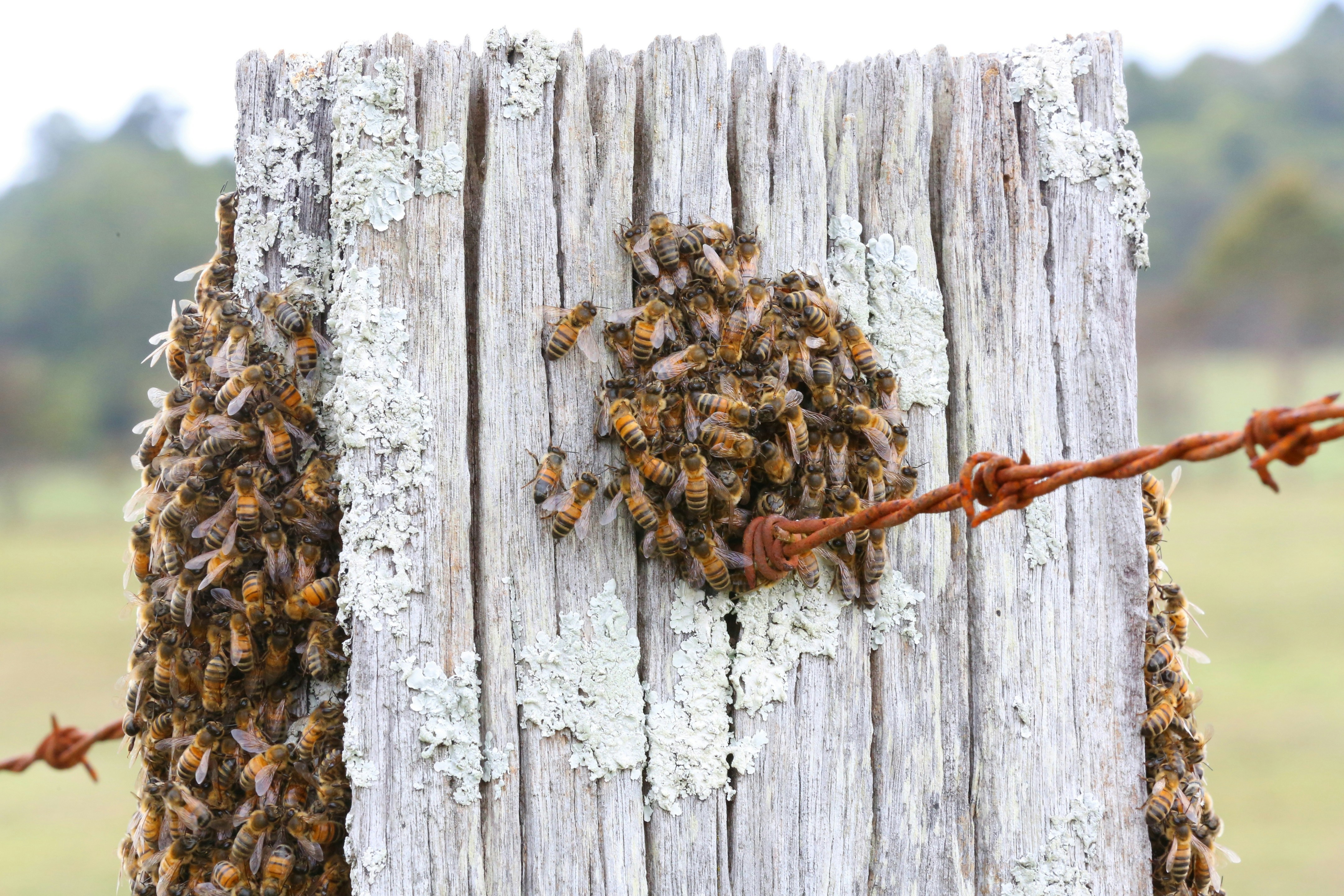 Bees swarming onto fence post entering hollow post through barbed wire strand hole