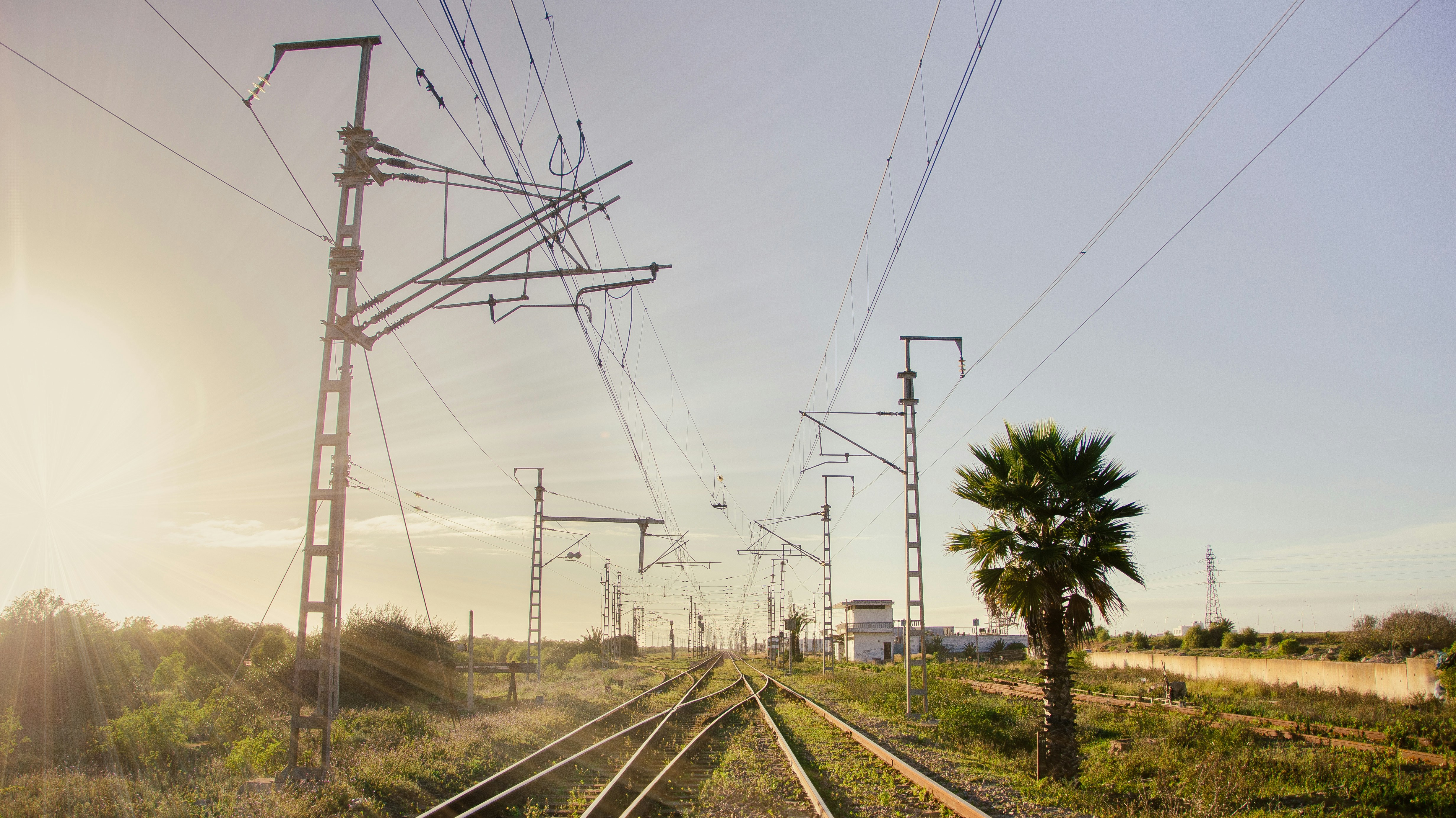 a train track with a palm tree in the foreground