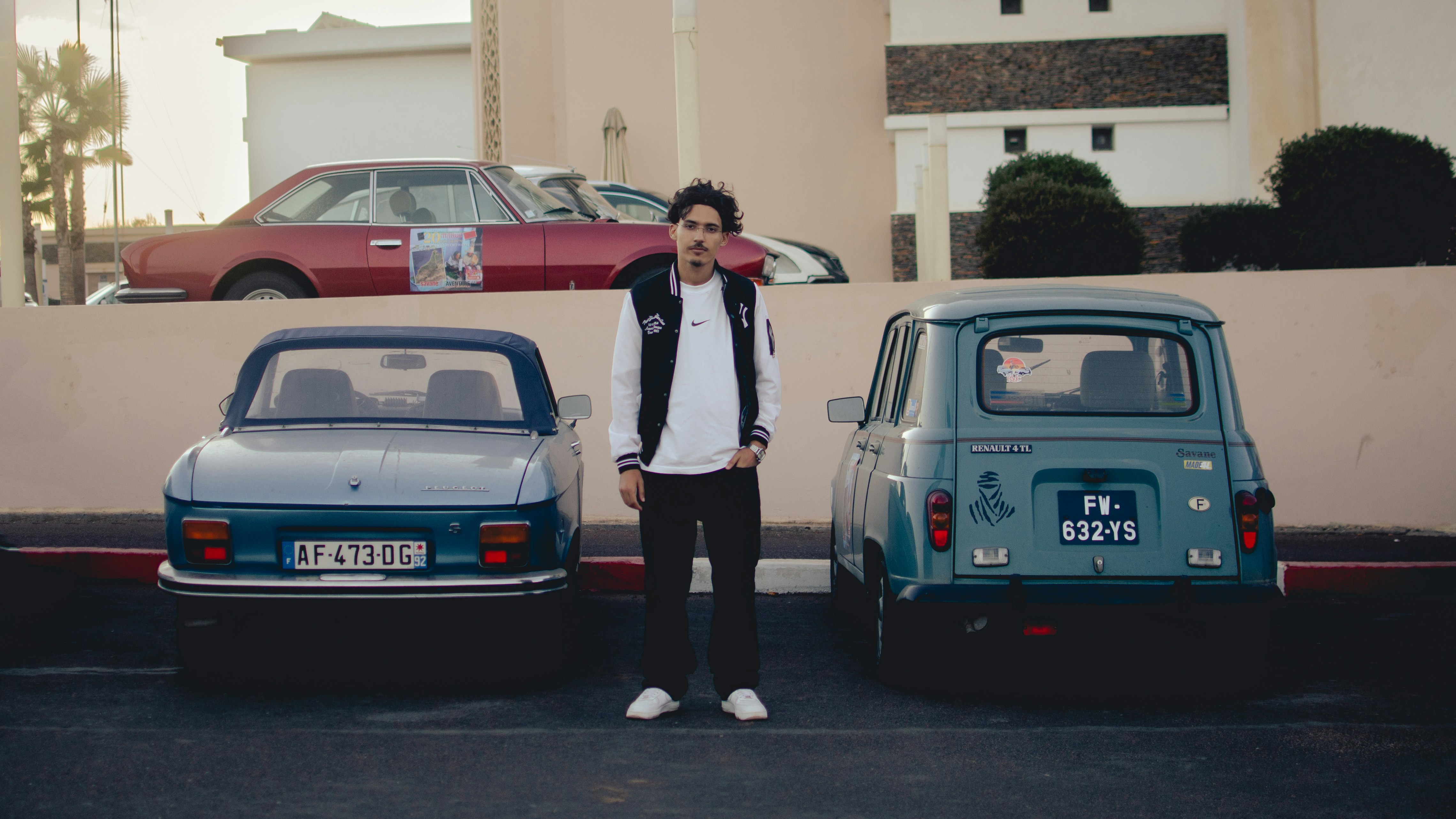 Man standing between two vintage cars