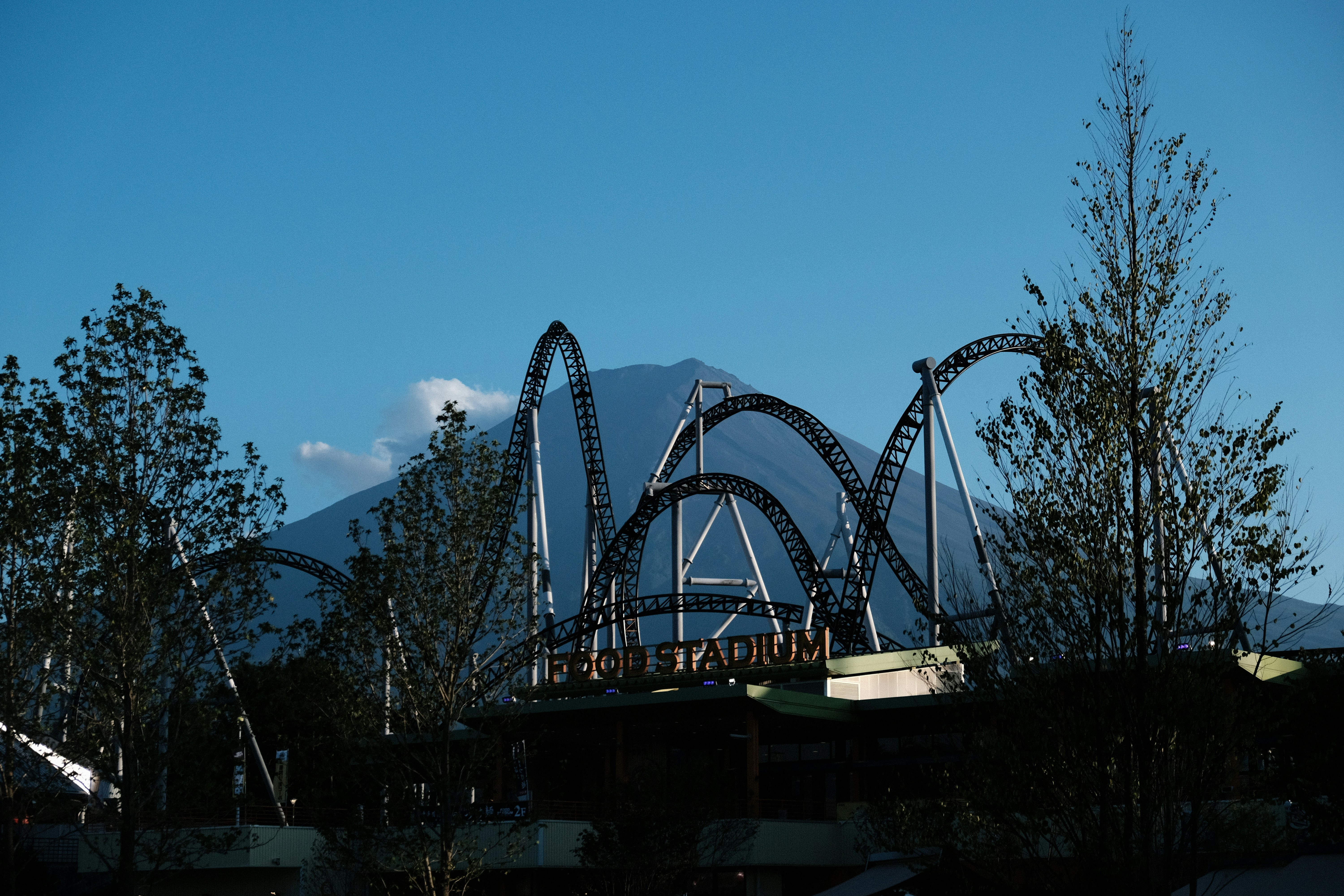 a roller coaster with a mountain in the background