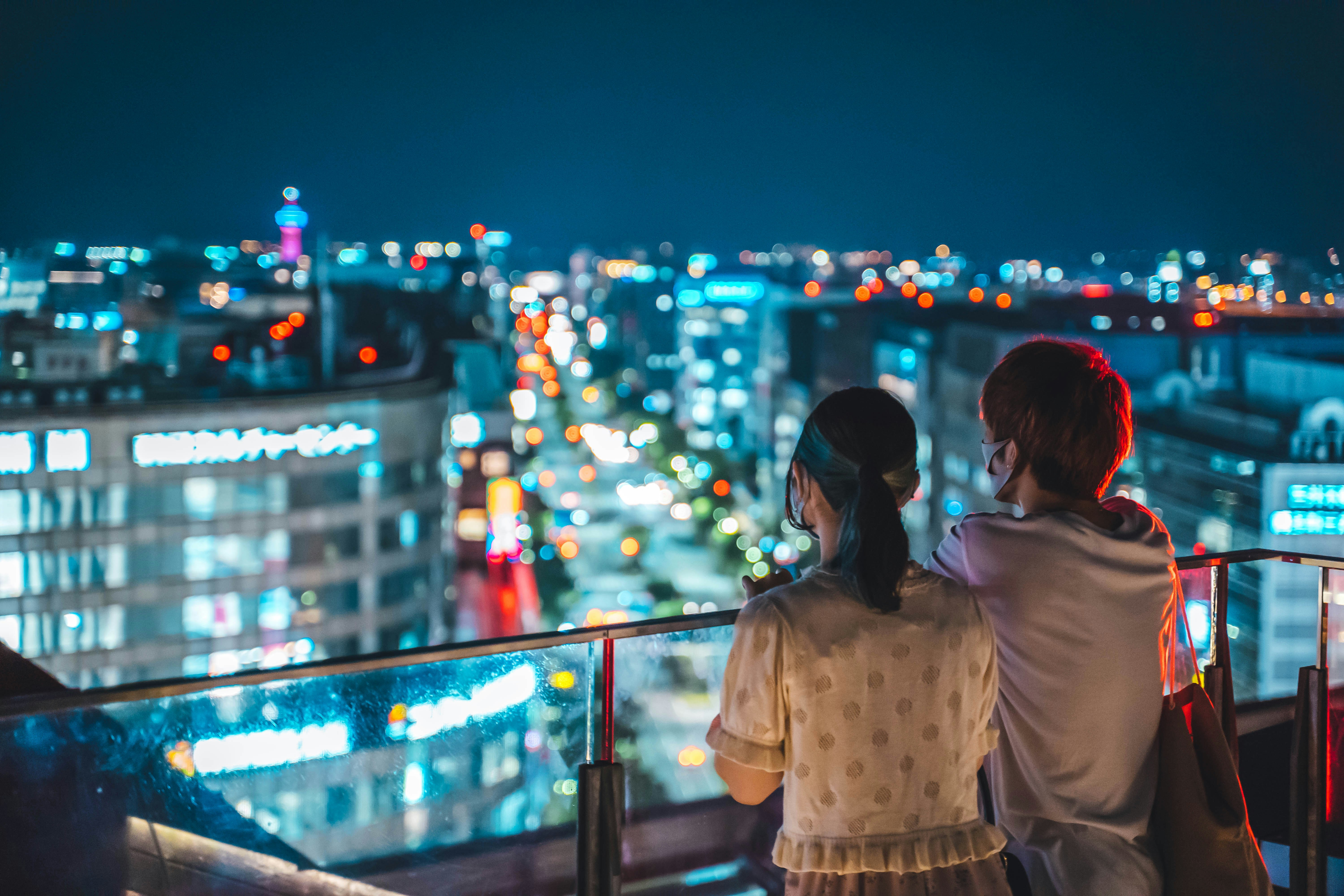 Japanese couple in Fukuoka on the top of Hakata Station.