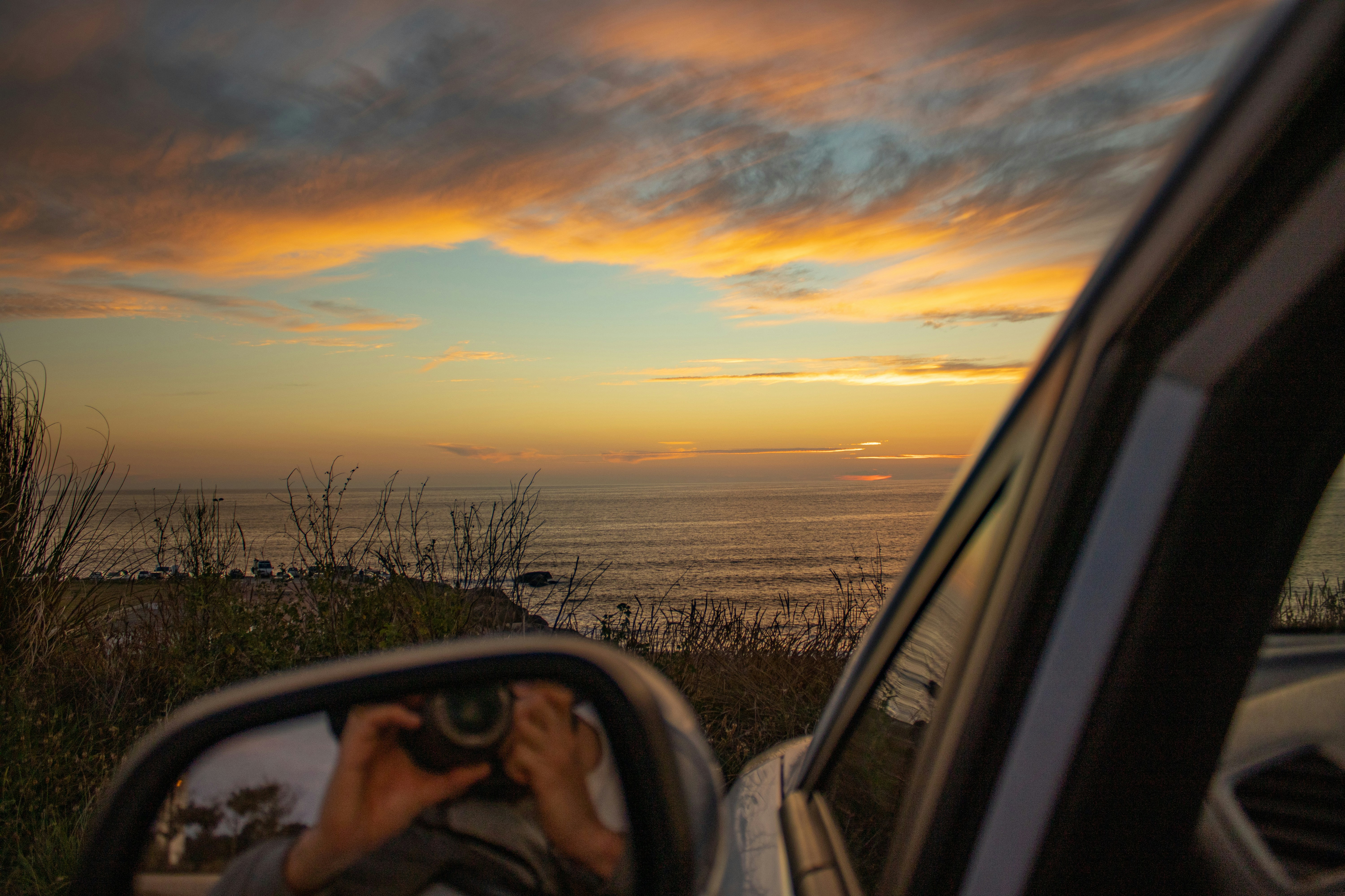 a person taking a picture of a sunset in a car mirror