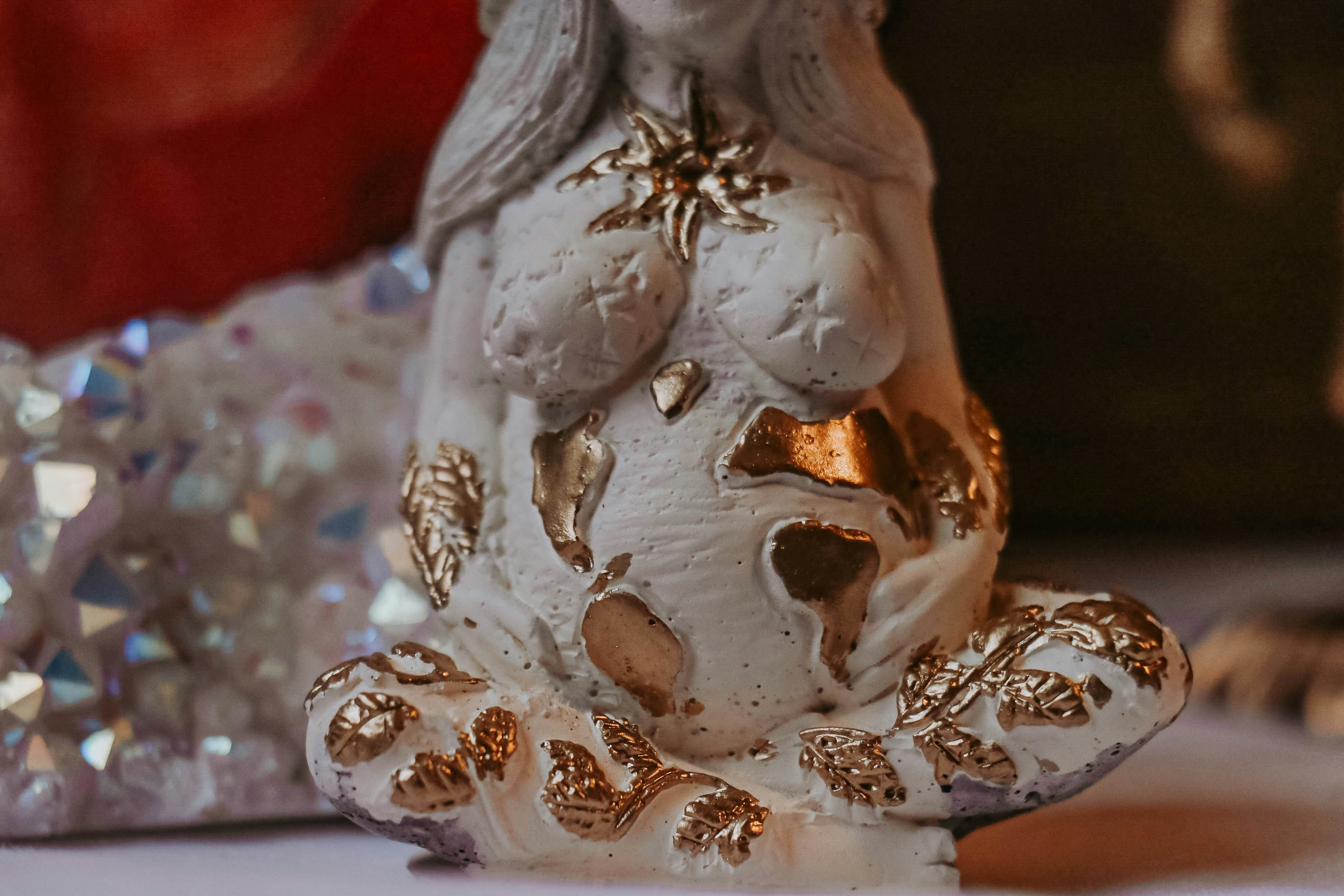 a white and gold figurine sitting on top of a table