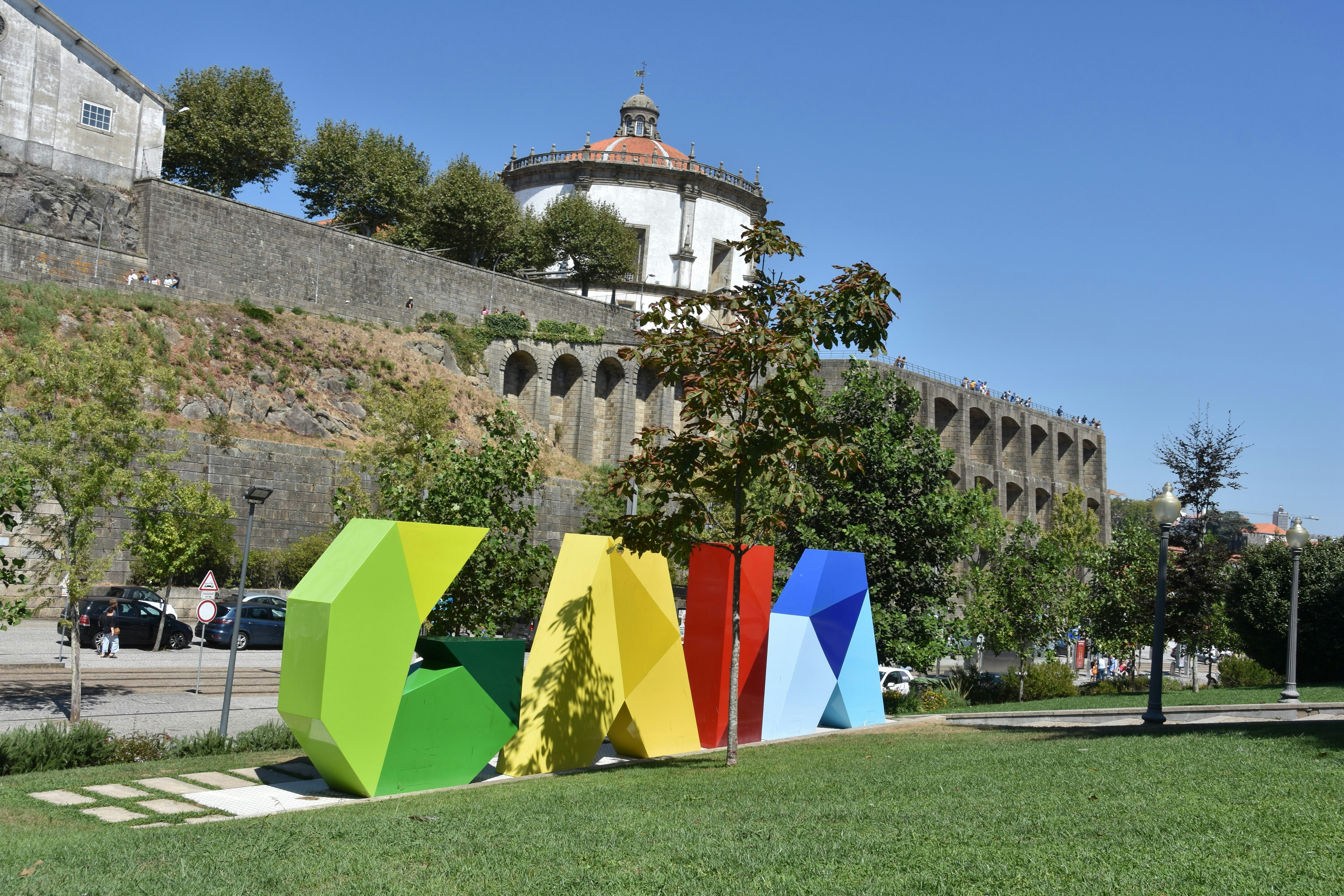 a group of tents in a grassy area with a building in the background
