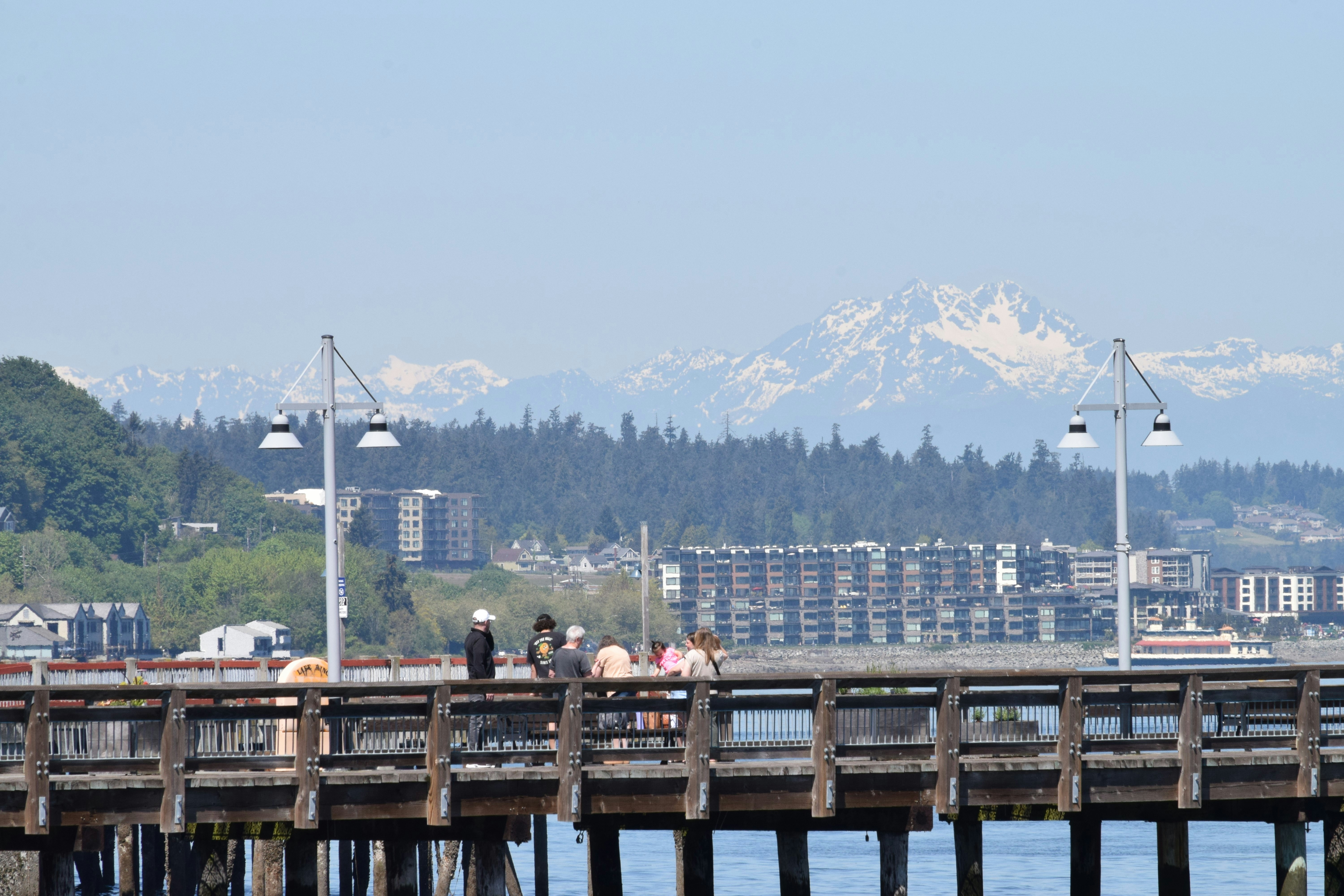 a group of people standing on a pier next to a body of water