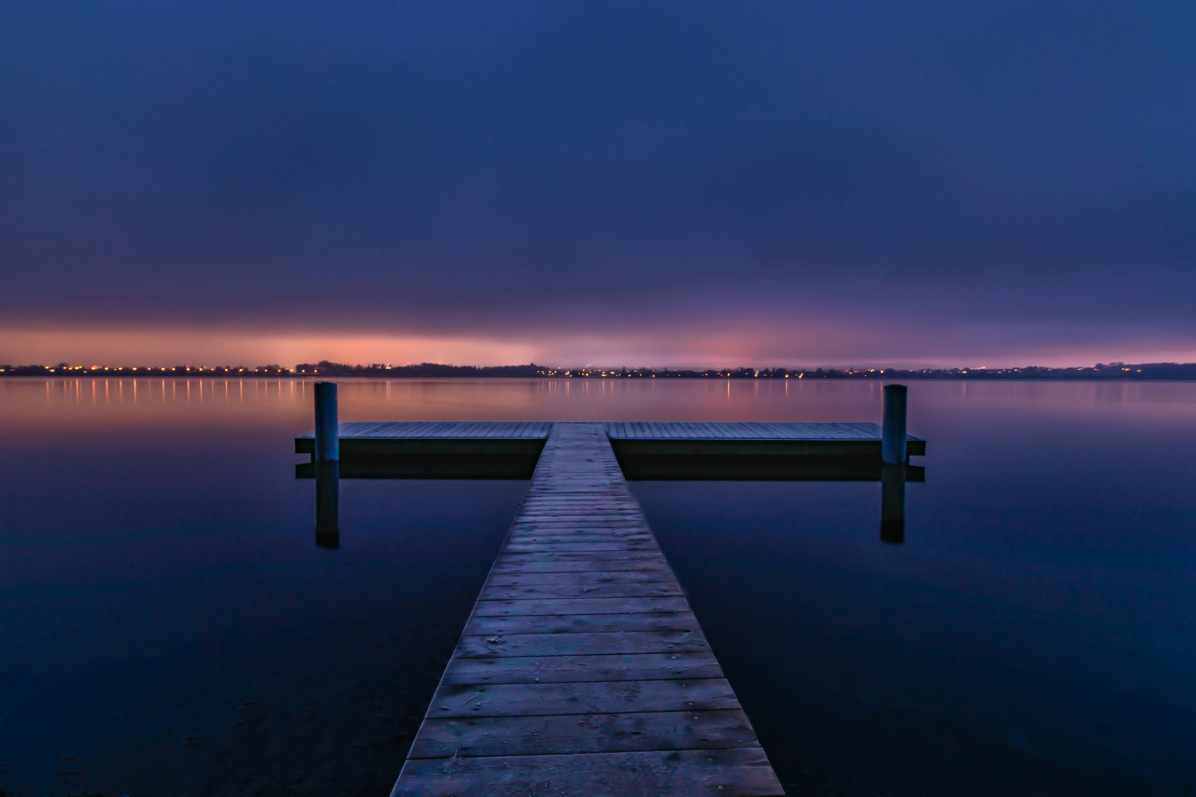 Lonley landing stage at the lake of Greifensee in Switzerland just before sunrise.