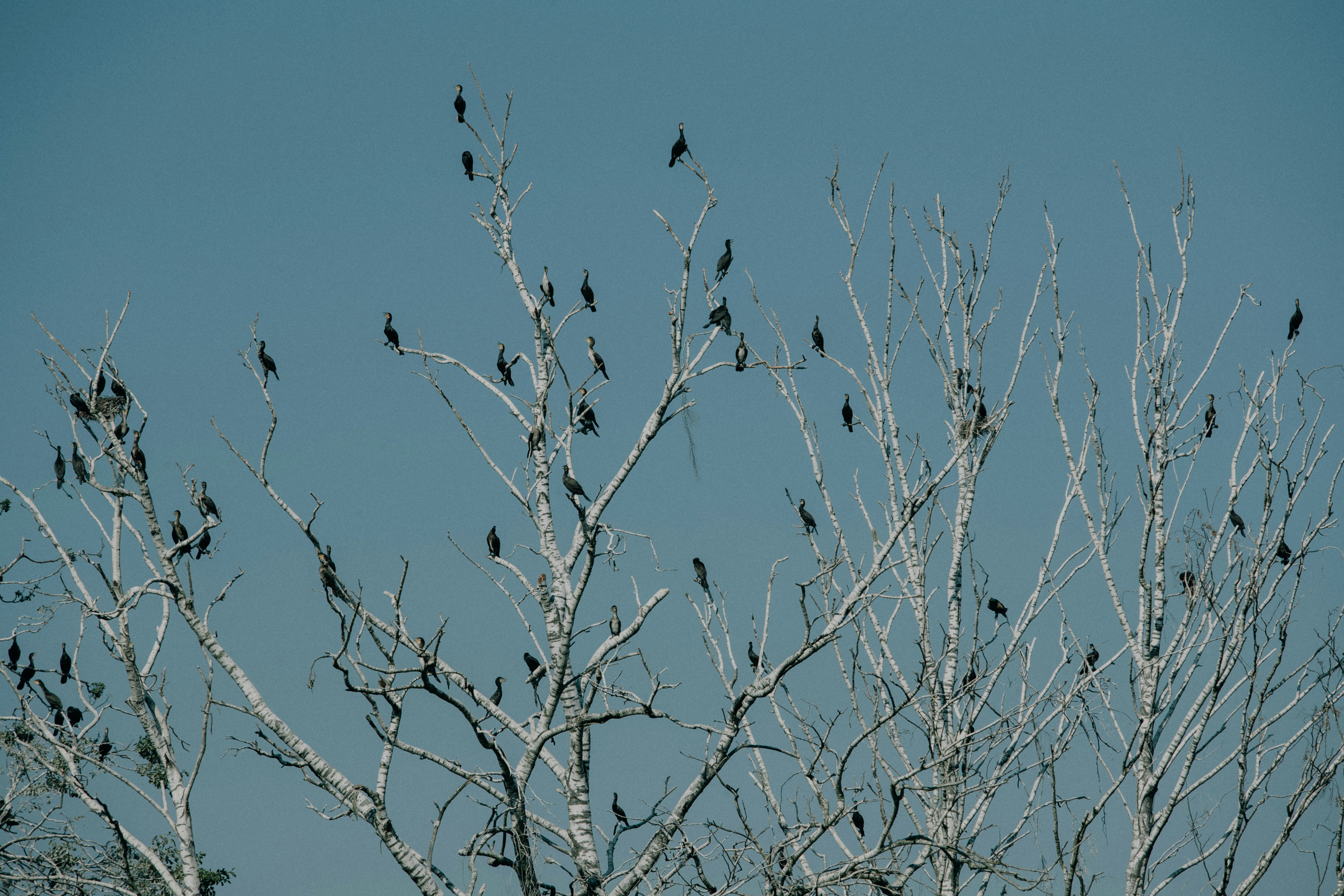 a flock of birds sitting on top of a tree