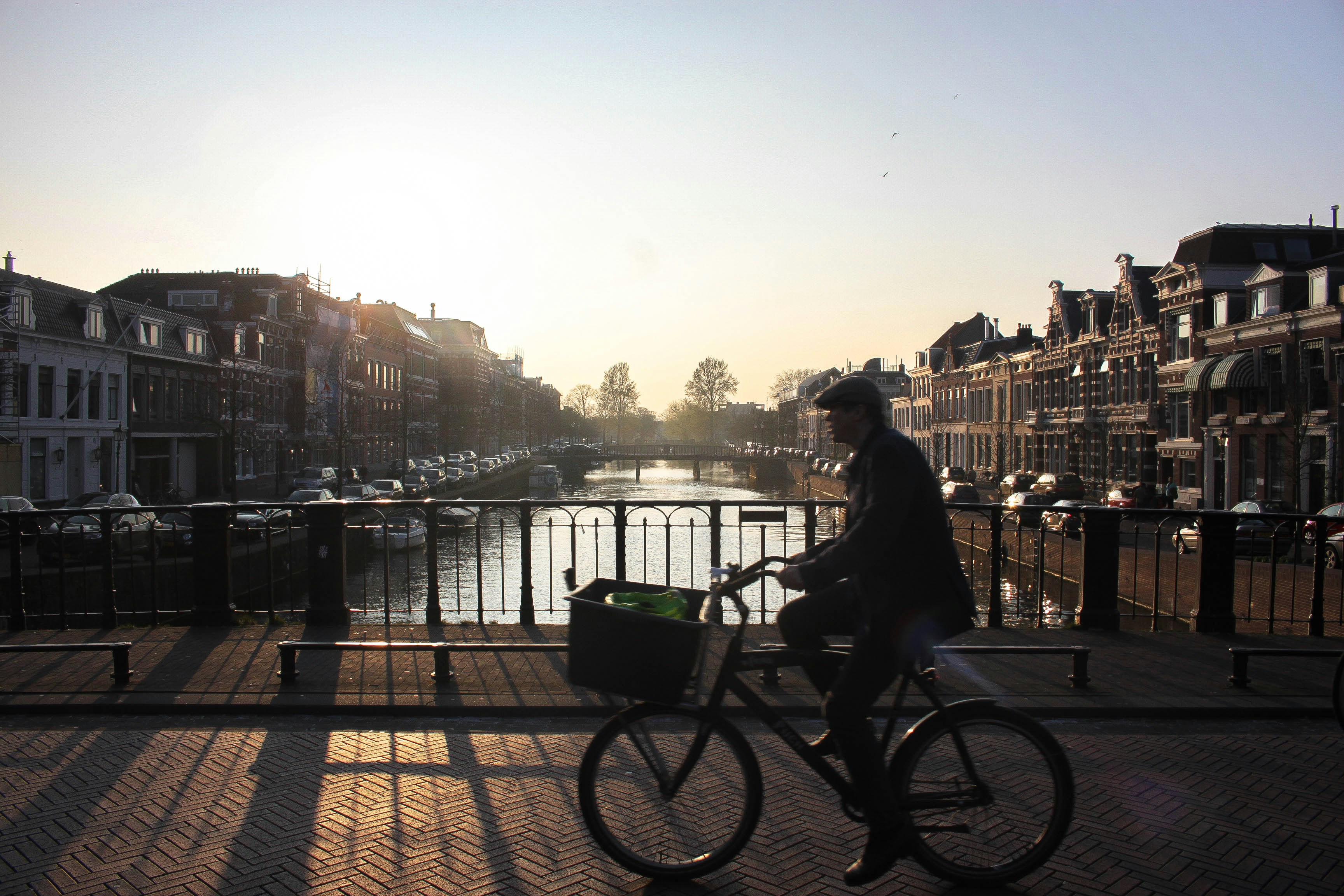 A man cycling over a bridge in the city of Haarlem.
