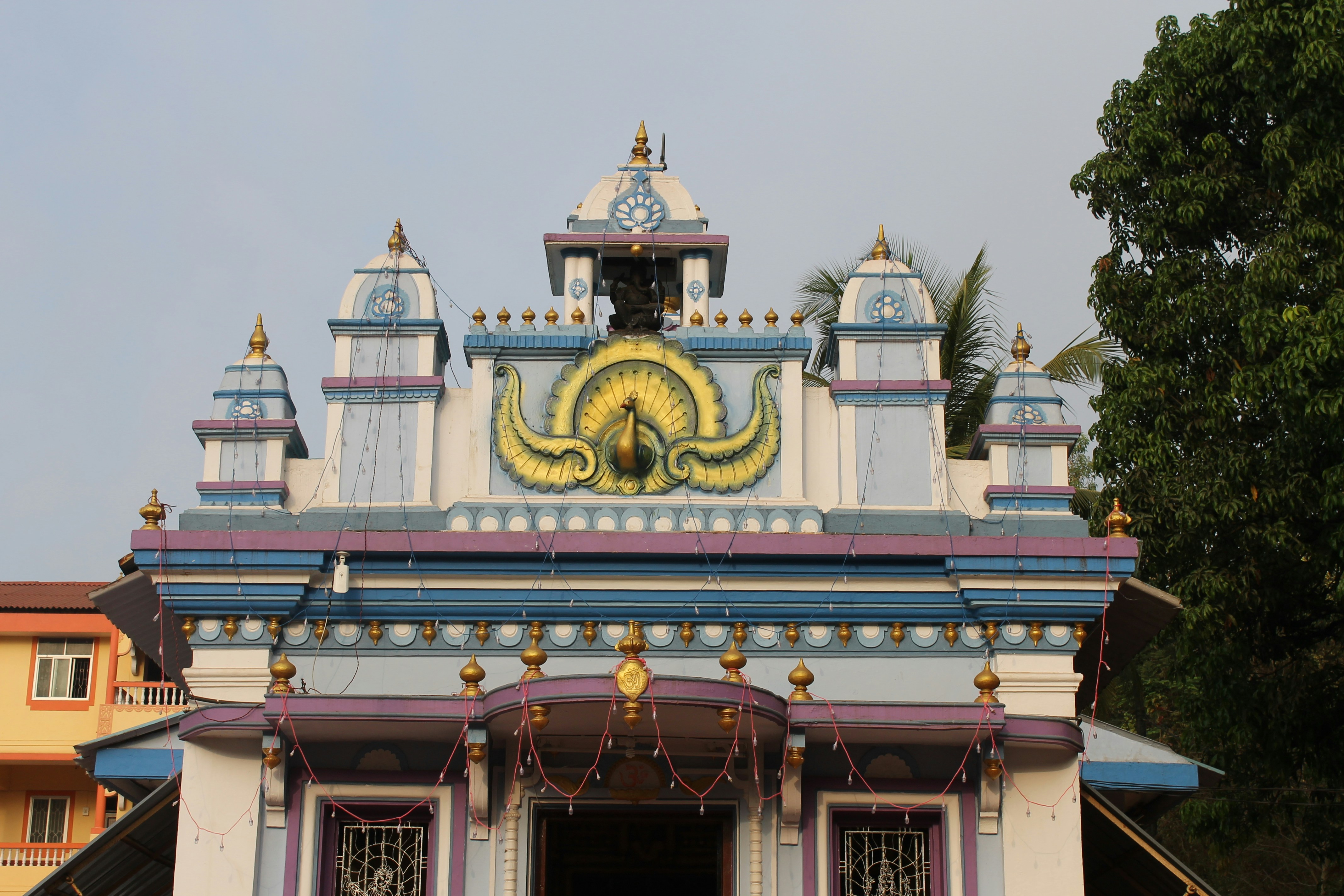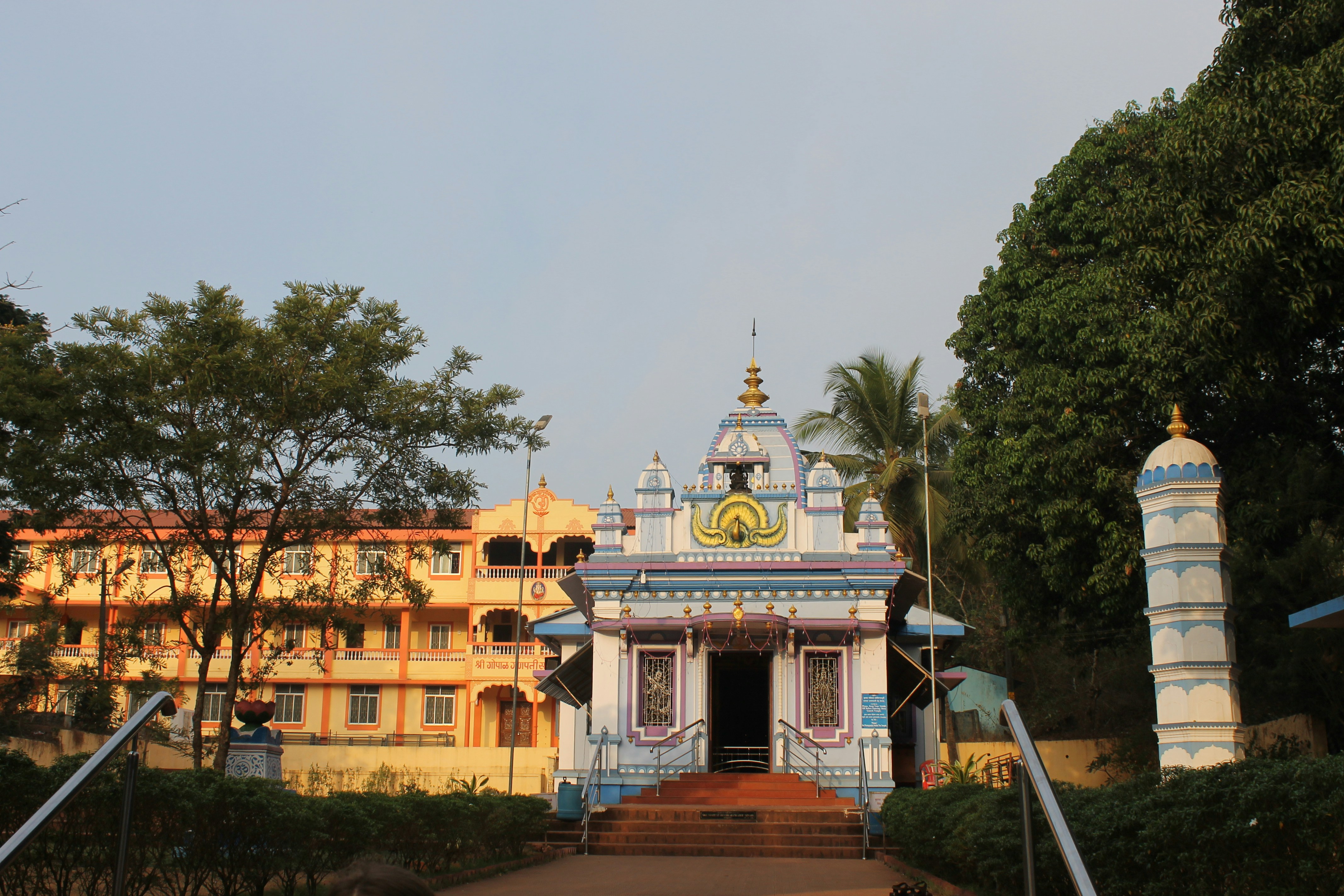 A serene view of the ancient Tambdi Surla Temple surrounded by lush greenery and a peaceful natural setting.