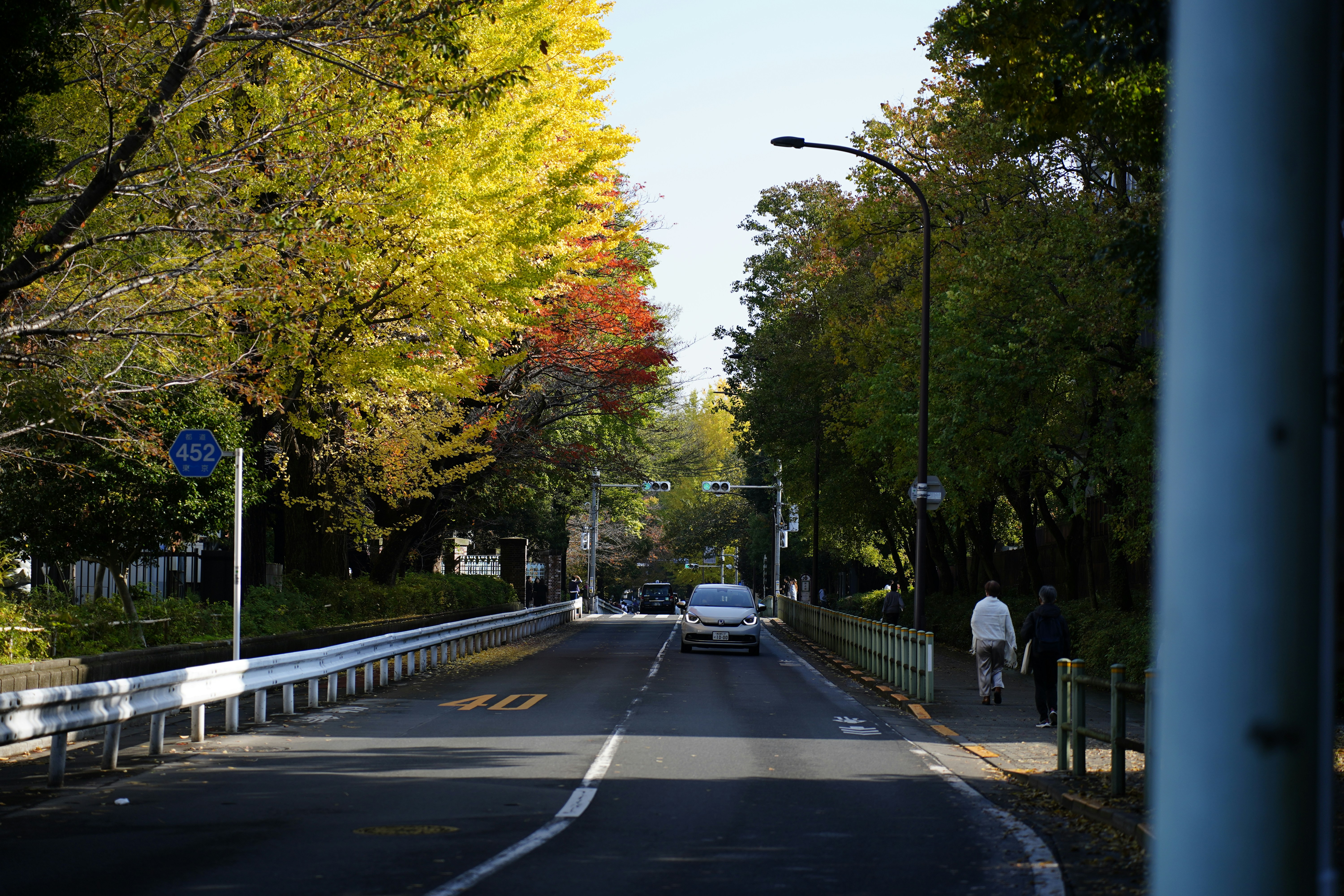 Autumn trees line a street with cars and pedestrians.