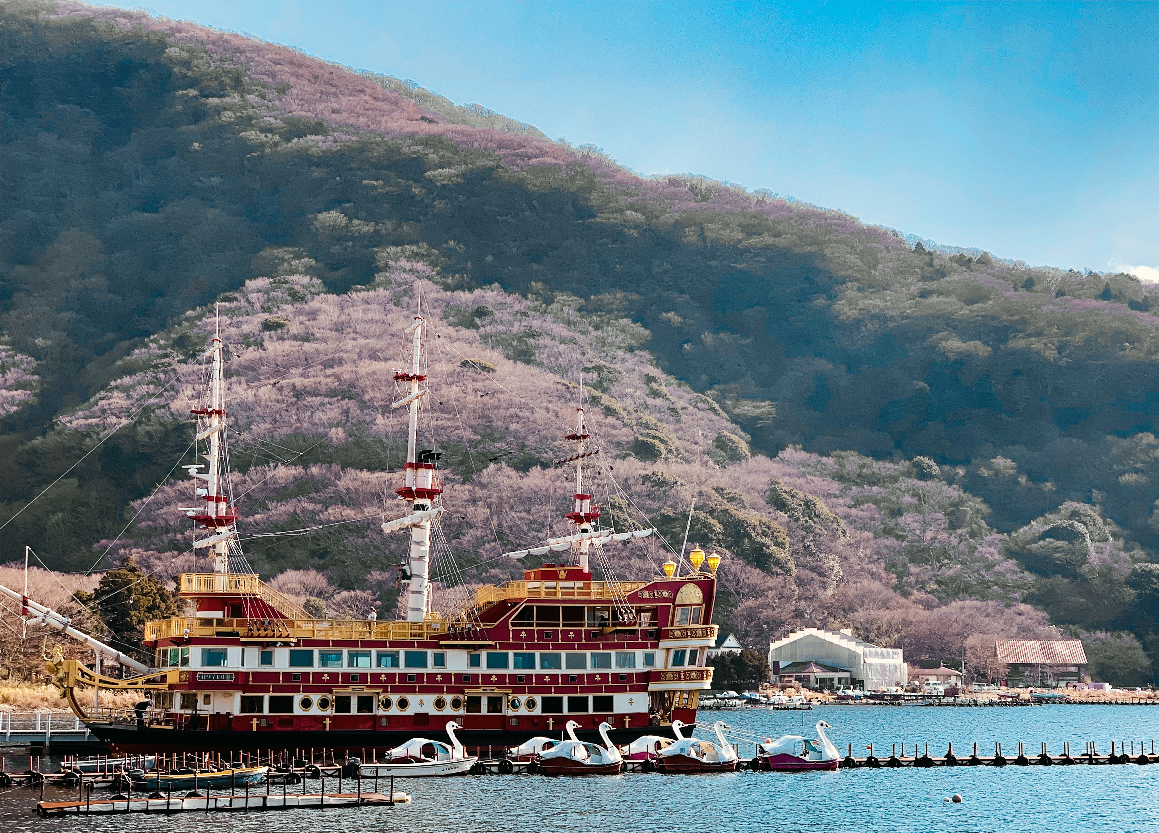 A boat and a Shinto arch on Lake Ashi, Hakone, Japan