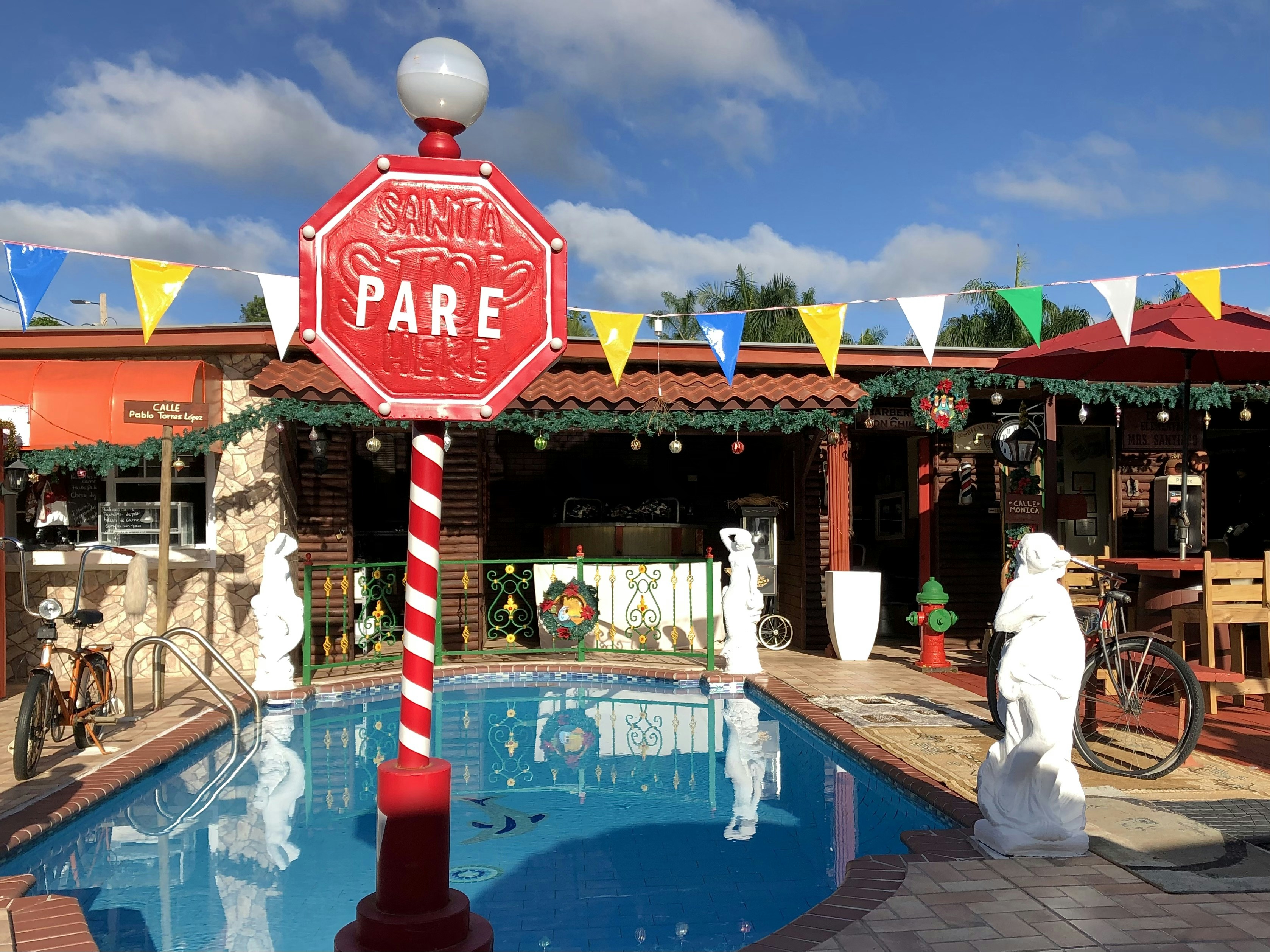 a stop sign in front of a swimming pool